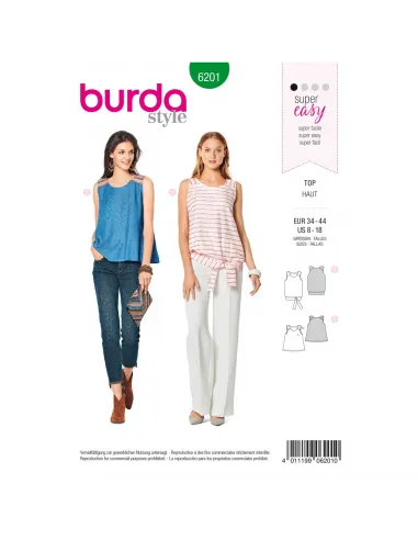 Patron de couture pour coudre un top femme évasé, Tip-Top pour l'été. À confectionner soit dans sa version évasée soit avec une large ceinture au-dessous de la taille, légèrement drapée et à nouer. Les empiècements sur l'épaule déclinés dans une autre étoffe contrastante, ou une trame perpendiculaire, ajoutent une note supplémentaire au modèle. Tailles femme : 34 - 44 EUR (du 36 au 46 FR) Difficulté couture : Super Easy | Rapide & Facile à coudre - spécial débutants Tissus conseillés: Viscose, crêpe, cotonnade légère Mercerie nécessaire pour les deux modèles : · entoilage thermocollant. · 100 à 115 cm de biais, largeur 4 cm. Instructions coutures incluses dans la pochette en Français, English, Deutsch, Español, Nederlands, Italiano, Svenska, Dansk, Pусский · AttentionMarges de couture non incluses sur le patron, prévoir 1 ou 2 cm supplémentaires depuis la ligne de couture et pourtour du patron · · Tous les modèles sont sous la protection des droits d’auteur, leur reproduction à des fins commerciales est strictement interdite ·
