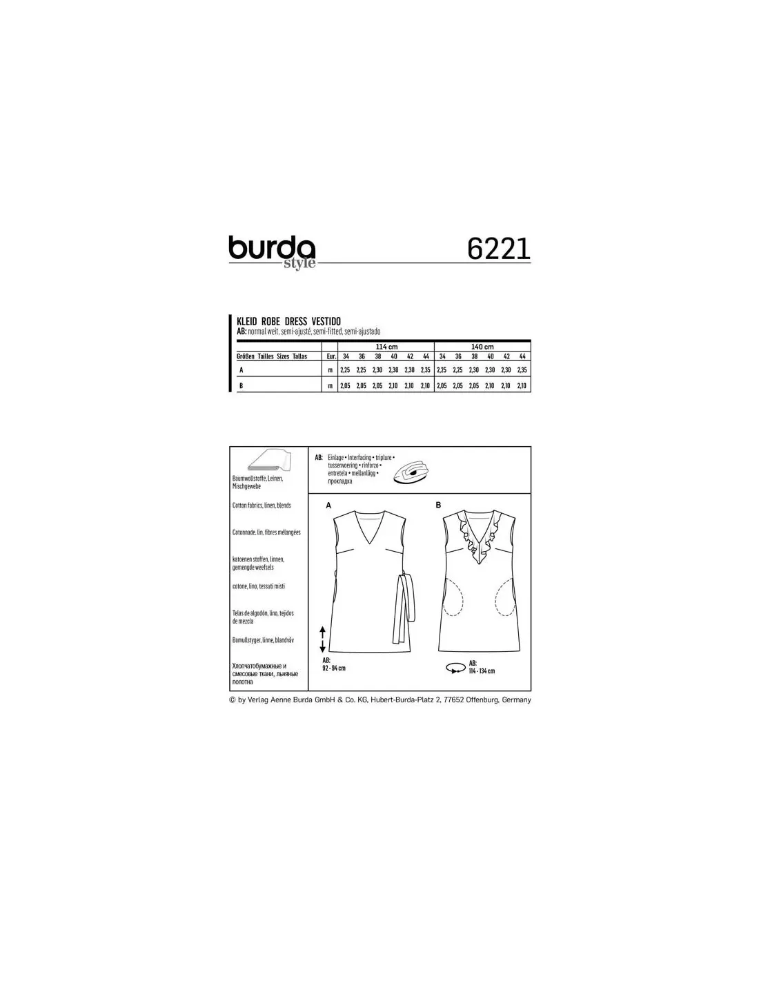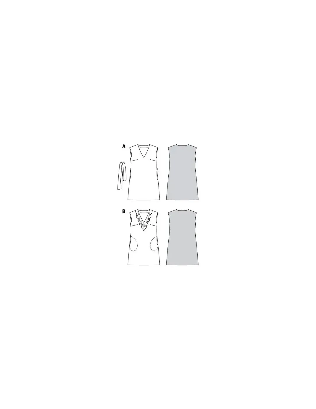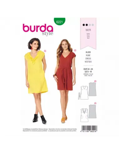 Cousez ces robes d'été simples, sans manche, au tombé fluide qui garantissent un confort absolu avec leur coupe droite trapèze. L'encolure en V, agrémentée ou non d'un volant, capte le regard. Avec une ceinture à nouer, coupée dans le même tissu que la robe, on peut ajuster à volonté le tour de taille. Tailles femme : 34 - 44 EUR (du 36 au 46 FR) La longueur totale de ces robes une fois confectionnées sont de 92 à 94 cm, mesures de la nuque au bord bas de la jupe. La circonférence du bord de la jupe est de 114 à 134 cm Difficulté couture : Facile à coudre Tissus conseillés: Cotonnade, lin, fibres mélangées Mercerie nécessaire pour les deux modèles : · entoilage thermocollant. Instructions coutures incluses dans la pochette en Français, English, Deutsch, Español, Nederlands, Italiano, Svenska, Dansk, Pусский · AttentionMarges de couture non incluses sur le patron, prévoir 1 ou 2 cm supplémentaires depuis la ligne de couture et pourtour du patron · · Tous les modèles sont sous la protection des droits d’auteur, leur reproduction à des fins commerciales est strictement interdite ·