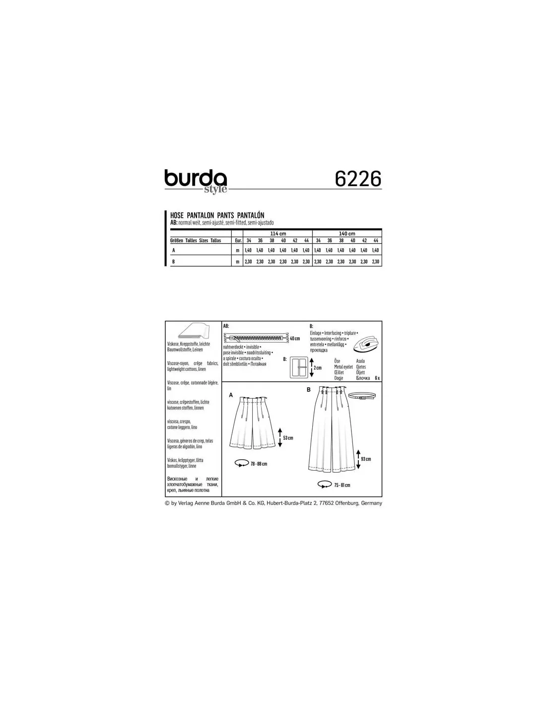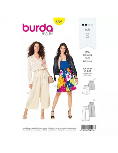 Avec ce bermuda ou ce pantalon taille haute façon jupe-culotte vous êtes dans l'air du temps et élégamment vêtue. Sur le devant, des plis de ceinture piqués qui s'ouvrent au-dessus et au-dessous de la taille. Le dos arbore des pinces. Dans la version B, la taille est en outre soulignée par une ceinture. Tailles femme : 34 - 44 EUR (du 36 au 46 FR) Difficulté couture : Facile à coudre Tissus conseillés: Viscose, crêpe, cotonnade légère, lin Mercerie nécessaire : · Modèles A & B: 1 fermeture à glissière invisible de 40 cm. · Modèle B: entoilage thermocollant. 1 boucle de ceinture largeur 2 cm avec ardillon. 6 œillets à riveter. Instructions coutures incluses dans la pochette en Français, English, Deutsch, Español, Nederlands, Italiano, Svenska, Dansk, Pусский · AttentionMarges de couture non incluses sur le patron, prévoir 1 ou 2 cm supplémentaires depuis la ligne de couture et pourtour du patron · · Tous les modèles sont sous la protection des droits d’auteur, leur reproduction à des fins commerciales est strictement interdite ·