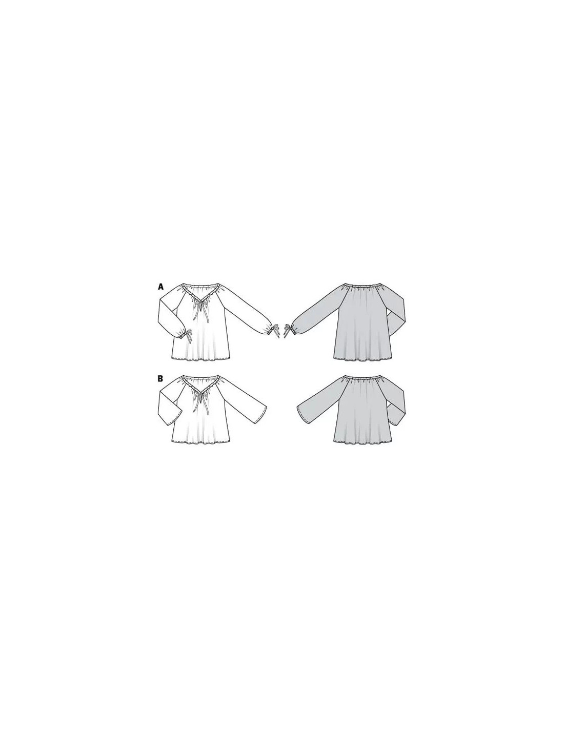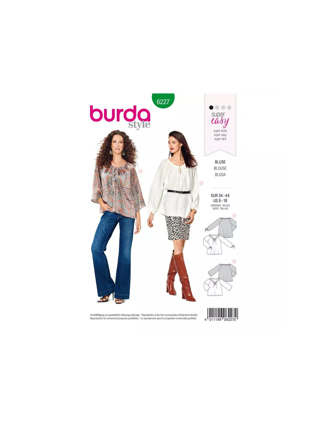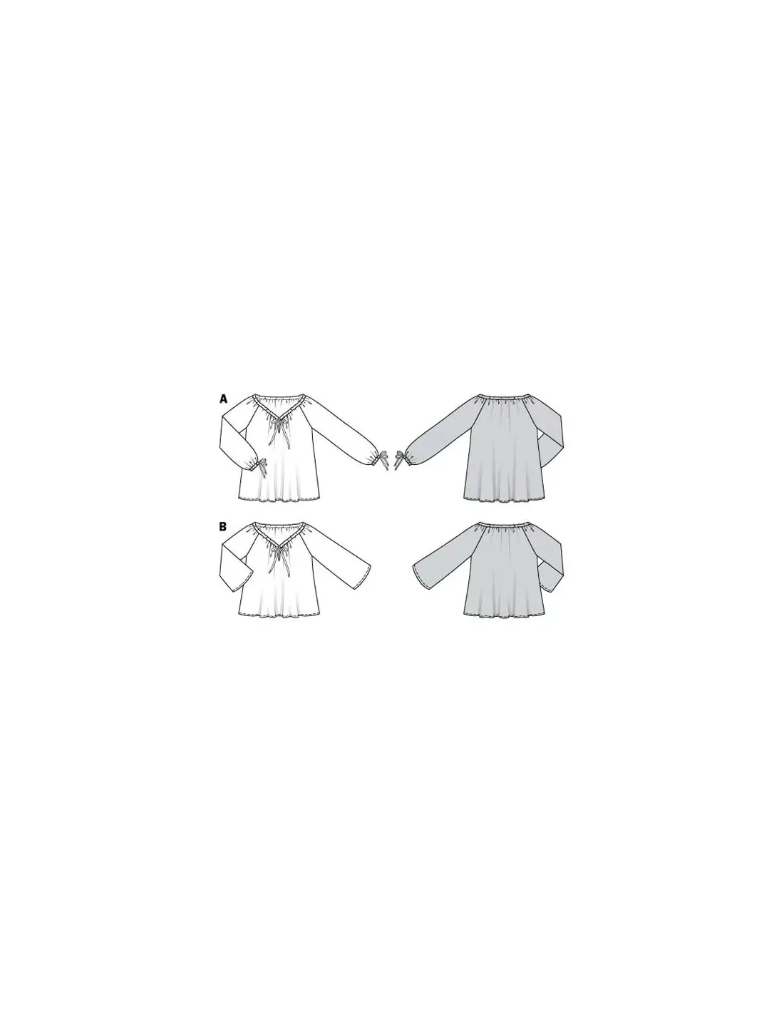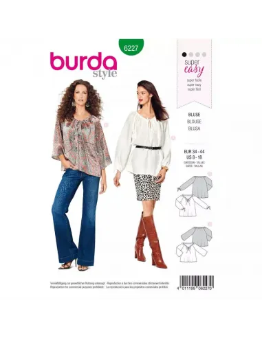 De charmantes blouses style Carmen, simples et vite cousues. Pour réguler la taille de l'encolure généreuse, il suffit d'enfiler un ruban dans le parement et de le nouer selon l'ampleur souhaitée. La blouse A a des manches longues, la blouse B des manches 3/4 évasées. Tailles femme : 34 - 44 EUR (du 36 au 46 FR) Difficulté couture : Super Facile & rapide à coudre | Spécial débutants Tissus conseillés: Cotonnade, lin, crêpe Instructions coutures incluses dans la pochette en Français, English, Deutsch, Español, Nederlands, Italiano, Svenska, Dansk, Pусский · AttentionMarges de couture non incluses sur le patron, prévoir 1 ou 2 cm supplémentaires depuis la ligne de couture et pourtour du patron · · Tous les modèles sont sous la protection des droits d’auteur, leur reproduction à des fins commerciales est strictement interdite ·
