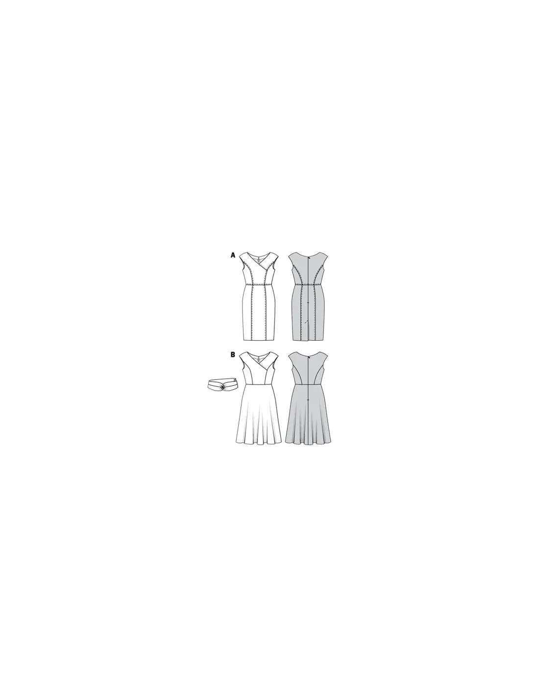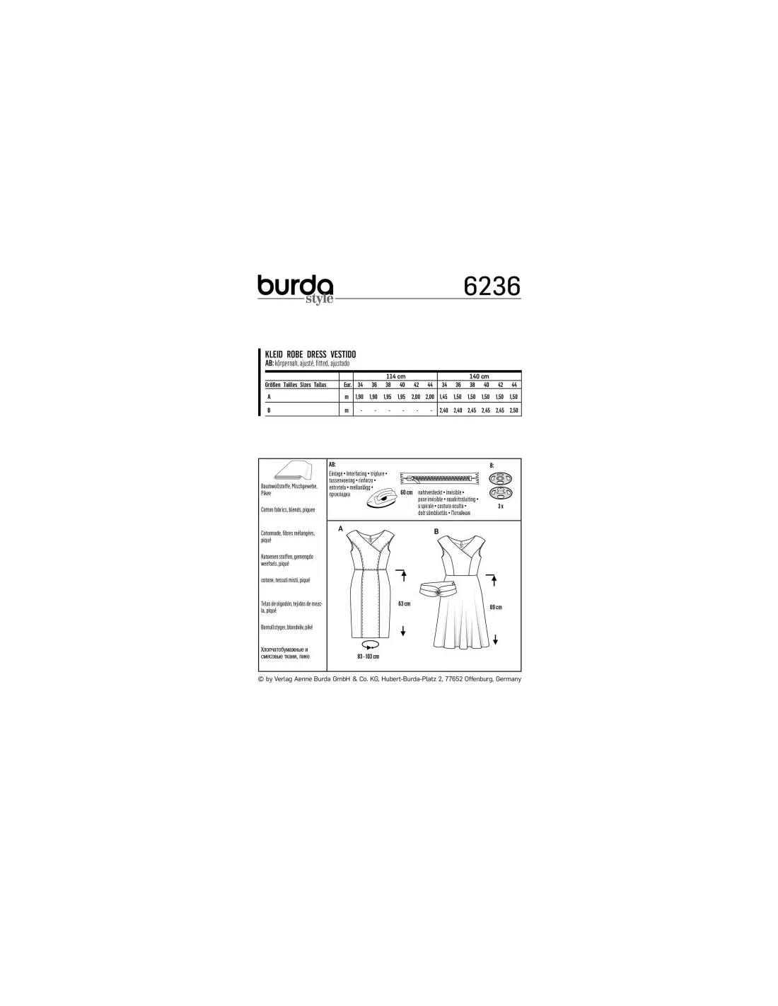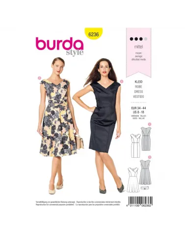 D'élégantes robes cintrées pour faire une entrée extraordinaire – le buste est croisé avec des épaules débordantes. La large encolure en V attire tous les regards. Et pour se démarquer, les jupes rapportées osent des formes différentes, l'une est droite avec une fente d'aisance, l'autre tombe en cloche. Tailles femme : 34 - 44 EUR (du 36 au 46 FR) La longueur de jupe de ces robes une fois confectionnées sont de 63 cm pour le modèle A et 69 cm pour le modèle B, mesures de la taille au bord bas de la jupe. La circonférence du bord de la jupe est de 83-103 cm pour le modèle A. Difficulté couture : Moyen, Intermédiaire Tissus conseillés: Cotonnade, fibres mélangées, piqué Mercerie nécessaire : · Modèles A & B: entoilage thermocollant. 1 fermeture à glissière invisible de 60 cm. · Modèle B : 3 boutons-pression à coudre. Instructions coutures incluses dans la pochette en Français, English, Deutsch, Español, Nederlands, Italiano, Svenska, Dansk, Pусский · AttentionMarges de couture non incluses sur le patron, prévoir 1 ou 2 cm supplémentaires depuis la ligne de couture et pourtour du patron · · Tous les modèles sont sous la protection des droits d’auteur, leur reproduction à des fins commerciales est strictement interdite ·