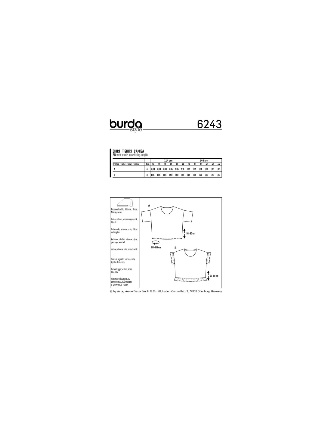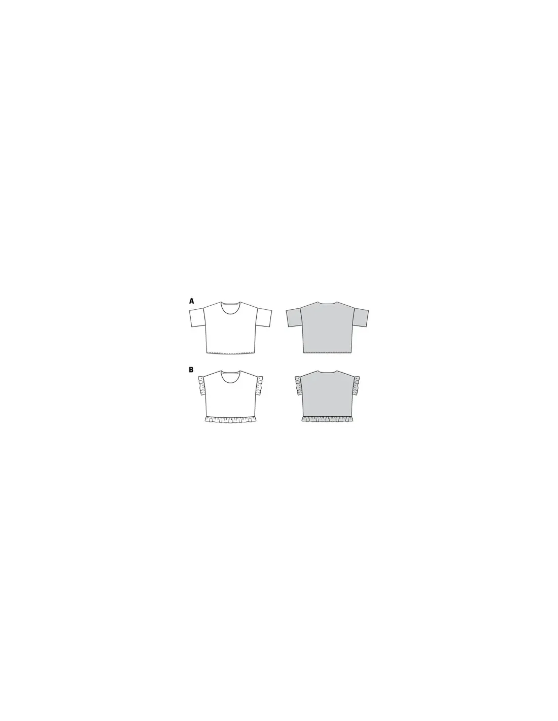 Des tee-shirts décontractés avec des épaules débordantes et une encolure ronde. Les larges manches droites de la variante A sont doublées. La variante B obtient de joyeux ruchés en guise de finitions. Tailles femme : 34 - 44 EUR (du 36 au 46 FR) La longueur de ces Top une fois confectionnés sont de 56-60 cm, mesures de la nuque au bord bas. Difficulté couture : Super Facile & Rapide à coudre | Spécial Débutants Tissus conseillés: Cotonnade, viscose, soie, fibres mélangées Instructions coutures incluses dans la pochette en Français, English, Deutsch, Español, Nederlands, Italiano, Svenska, Dansk, Pусский · AttentionMarges de couture non incluses sur le patron, prévoir 1 ou 2 cm supplémentaires depuis la ligne de couture et pourtour du patron · · Tous les modèles sont sous la protection des droits d’auteur, leur reproduction à des fins commerciales est strictement interdite ·