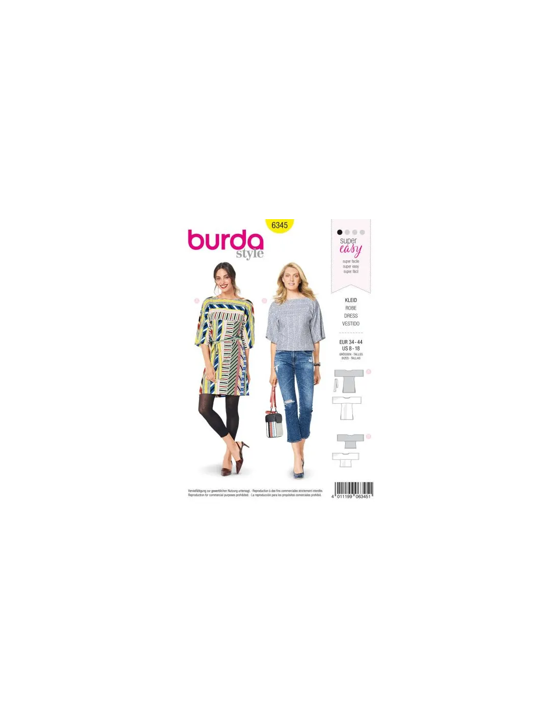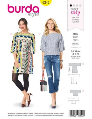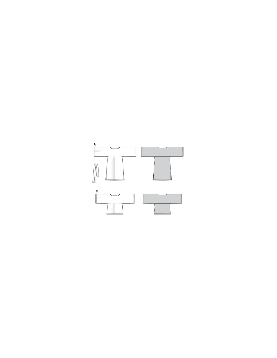 Une robe décontractée avec des fentes latérales et une ceinture à nouer. Les manches sont intégrées aux empiècements. Le tee-shirt B de même coupe est simplement raccourci. Ici, c'est le jeu de rayures qui apporte beaucoup de plaisir.