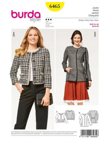 Des vestes sans col pour la mi-saison. Les coutures de découpe les adaptent à la silhouette. Pour la courte veste A, privilégiez des tissus structurés et ornez les bords avec des franges. La longue veste B séduit par ses touches discrètes, empruntées au folklore traditionnel, et ses poches prises dans les coutures de découpe. Tailles EUR : 34 à 46Tissus conseillés : A : bouclette, B : lainage, lodenNiveau de couture : moyen Langues incluses: Français, Deutsch, English, Español, Nederlands, Italiano,Svenska, Dansk, Pусский