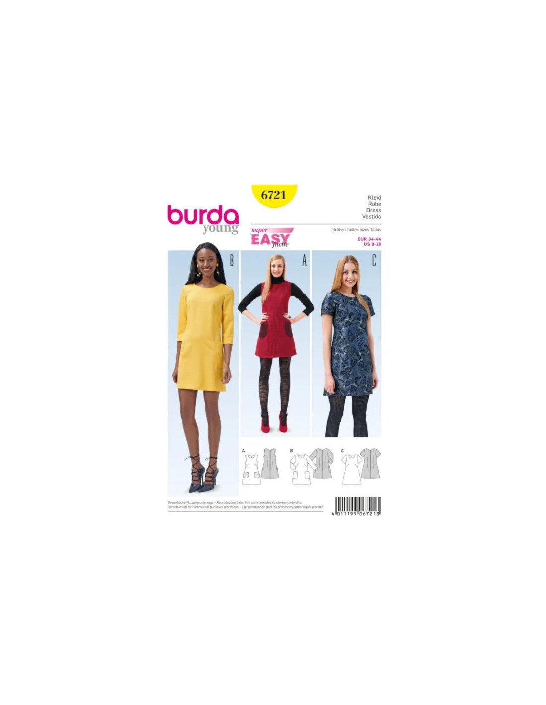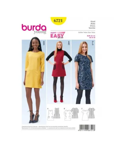 Robe, robe à bretelles évasées – poches plaquéesCes robes juvéniles, vite cousues, marient désinvolture et sobriété pour s'afficher au quotidien. Même lors de vos sorties, elles seront de la partie. Vous avez le choix entre deux longueurs de manche et la robe sans manches. Tailles femme 34 à 44 (US 8-18)Niveau couture: Super Facile, rapide, idéal pour débutantTissus conseillés: Lainage léger, toile en fibres mélangées, linLangues incluses: Français, Deutsch, English, Español, Nederlands, Italiano,Svenska, Dansk, Pусский