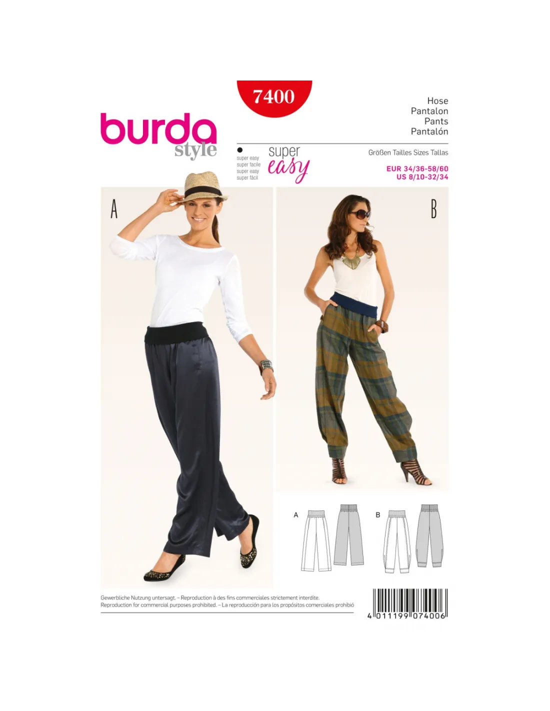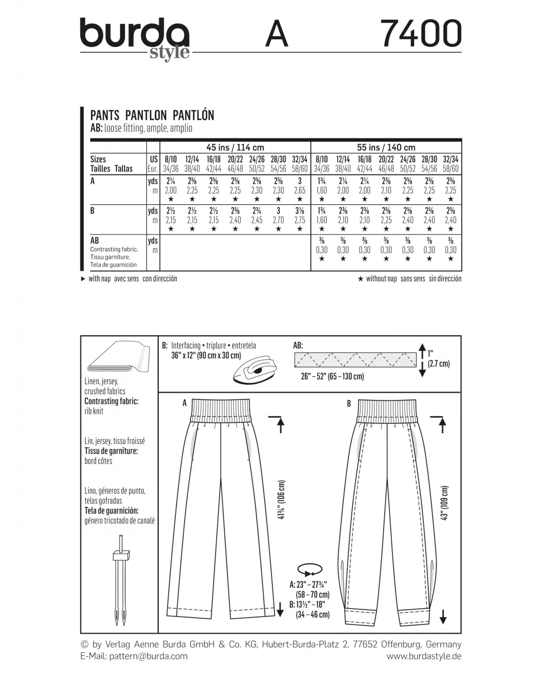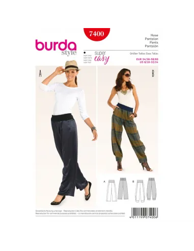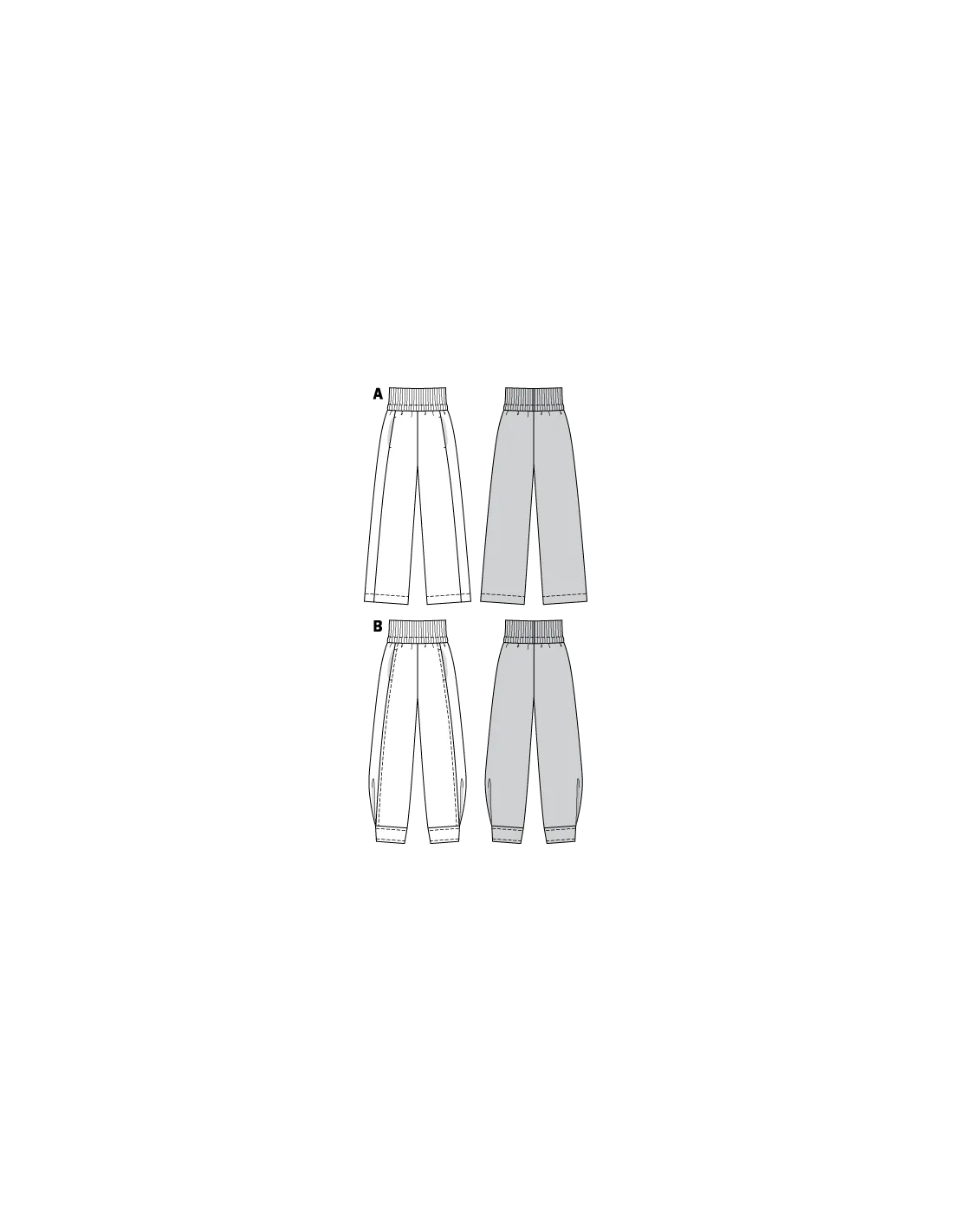 Ces pantalons faciles à enfiler ne sont pas seulement réservés au sport et aux loisirs.Leur ceinture en tissu bord-côte mailles, les coutures latérales décalées sur le devant, les poches prises dans les coutures, donnent le ton.Le modèle A choisit des jambes de pantalon larges, le modèle B se resserre sur le bas des jambes grâce à des bords-côtes.Tissus conseillés : lin, jersey, tissus crashTissu de garniture : tissu tricot bord-côtes
