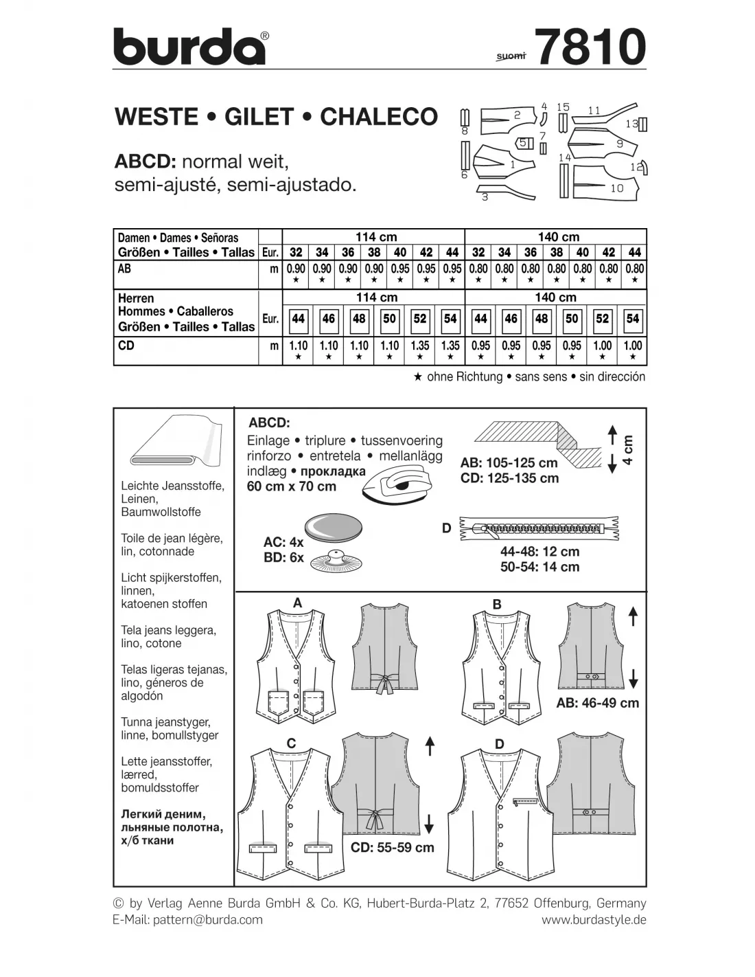Veste Gilet mixteCe gilet (AB pour les femmes, CD pour les hommes) est indispensable dans toute garde-robe et complète aussi bien les t-shirts que les chemises et les blouses de façon très tendance. Différents tissus et détails ainsi que différentes possibilités de mix créent toujours un look nouveau. . Tailles femme: 32 à 44 (US 6-18)Tailles hommes: 44 à 54 (US 34-44)Niveau couture: Super Facile, rapide, spécial débutantTissus conseillés: Toiles de jean légères, cotonnades, lin. Langues incluses: Français, Deutsch, English, Español, Nederlands, Italiano, Svenska, Dansk, Pусский.