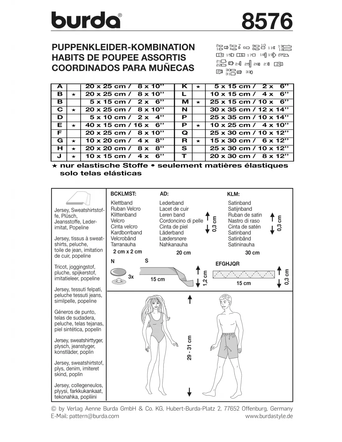Vêtement de poupéesNiveau couture: facileMarges de couture compriseshauteur de poupée: 29 - 31 cm Une garde-robe bien garnie, pour habiller sa poupée ou son baigneur à l’infini: robe à bretelles, tops, jupes, tee-shirts, vestes et pantalons. Tissu(s) conseillé(s): jersey, jersey molletonné, tissu peluche, toile jean, cuir synthétique, popeline. Langues incluses: Français, Deutsch, English, Español, Nederlands, Italiano, Svenska, Dansk, Pусский.