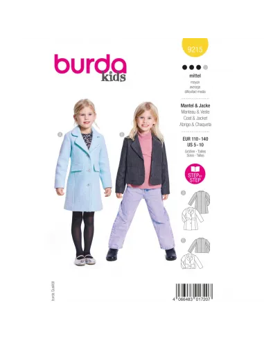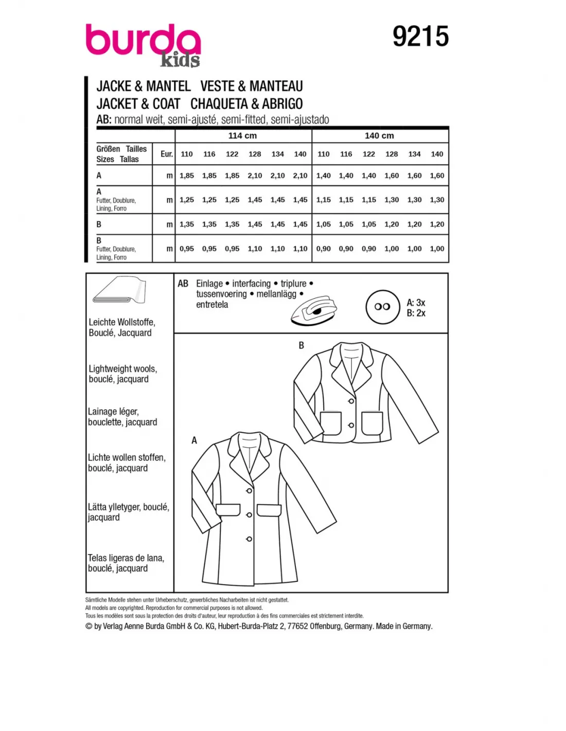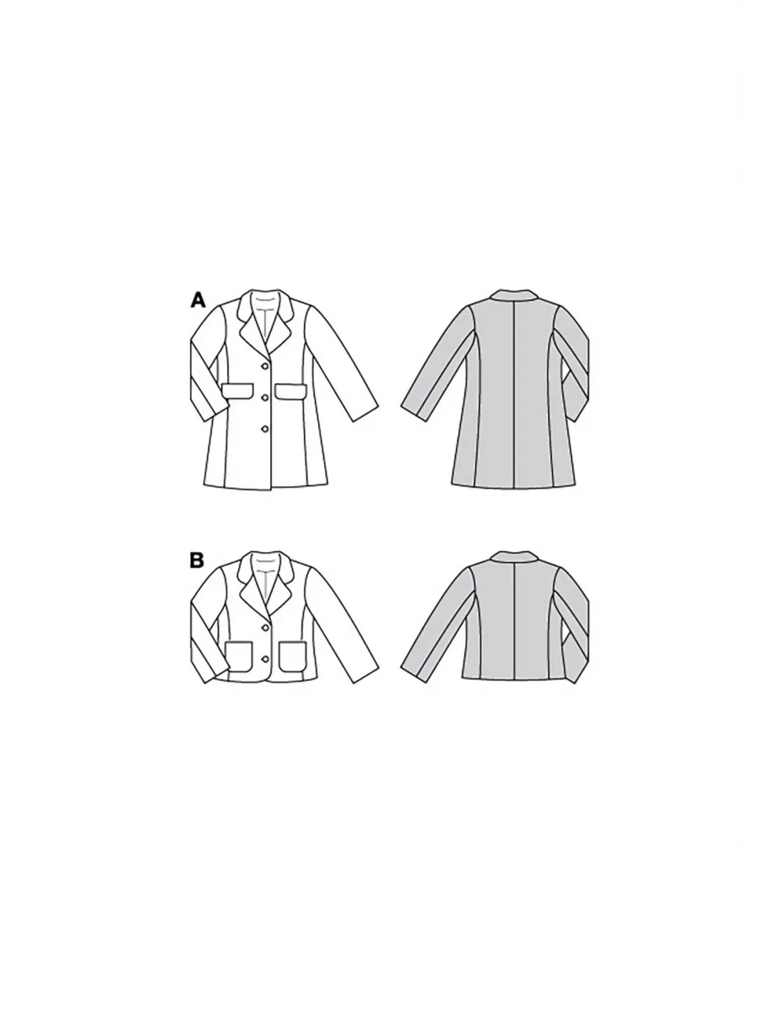 Parfait pour les petites fashionistas ! Notre manteau pour enfants en bouclé à la coupe étroite leur permet d'exprimer leur style dès leur plus jeune âge. Avec des détails classiques comme le col à revers et les poches à rabat, ce manteau est un must pour les petites filles qui ont du style. Pour aller avec le patron de manteau, il y a notre blazer pour enfants, à la coupe un peu plus douce, mais tout aussi chic avec ses poches plaquées. Idéal pour les lainages légers, le bouclé ou le jacquard. La mode Mini-me n'a jamais été aussi mignonne. Mercerie: AB : entoilage thermocollant. A : 3 boutons. B : 2 boutons.