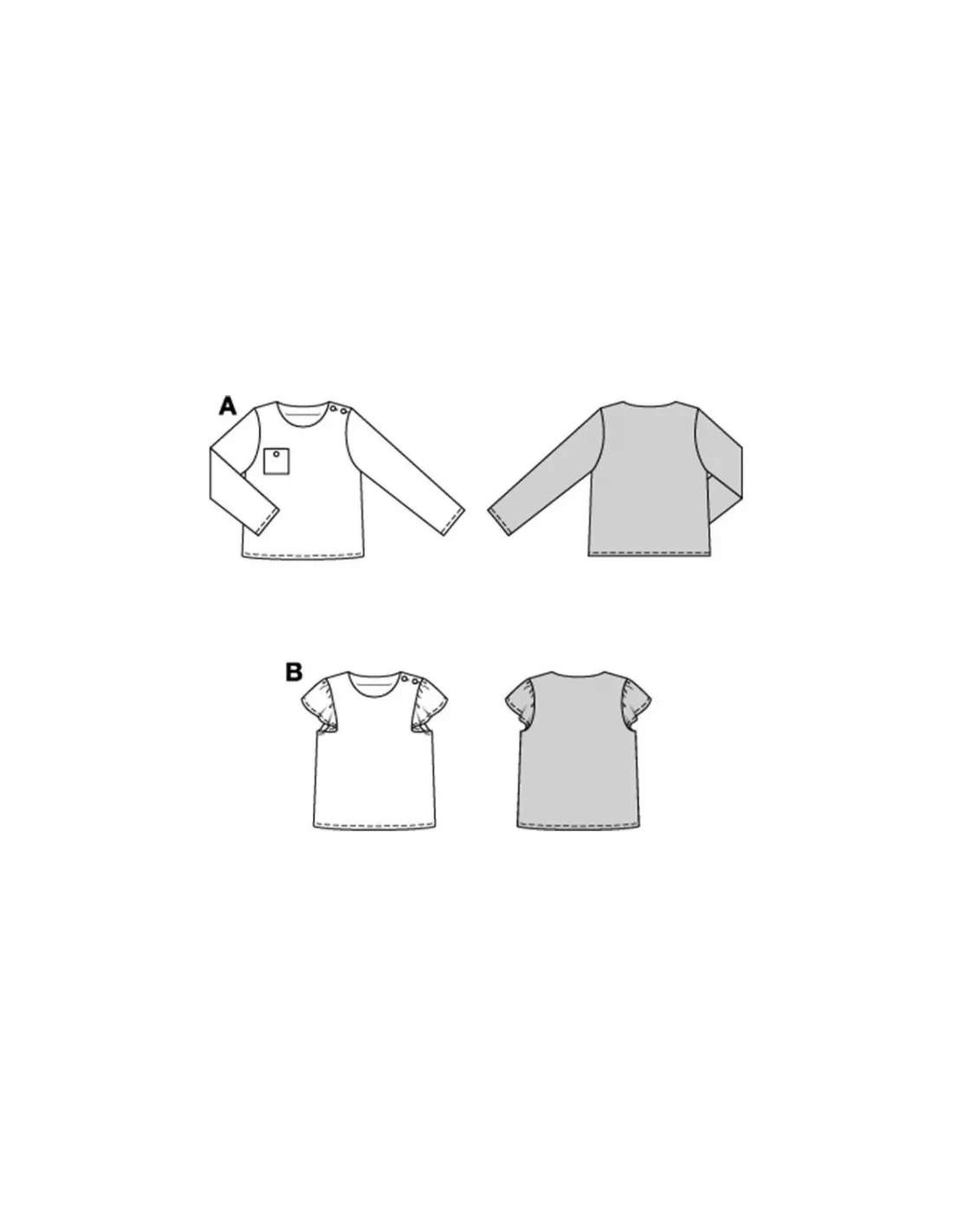 La joie de l'été est là ! Le patron du t-shirt unisexe que nous avons cousu en jaune citron enthousiasme les garçons et les filles avec sa coupe décontractée. Le t-shirt à manches papillon et à boutons bénéficie d'une mise à jour de son style et se porte avec des jeans, des shorts ou des jupes. Le plaisir de coudre des vêtements d'été pour enfants de niveau de difficulté 2 ! Tissus recommandés: Tissus en coton, viscose, lin, mousseline. Mercerie nécessaire: