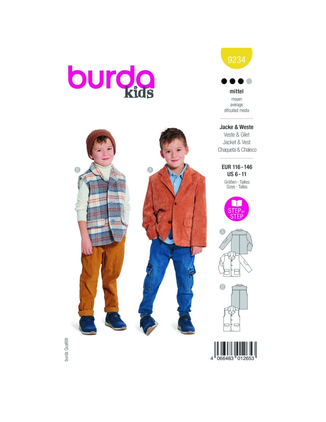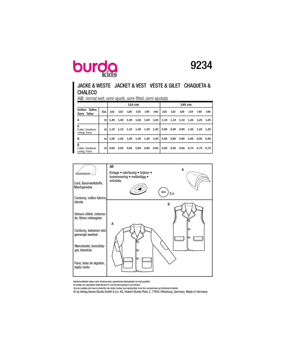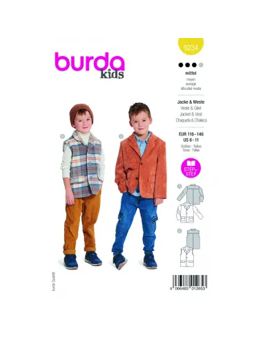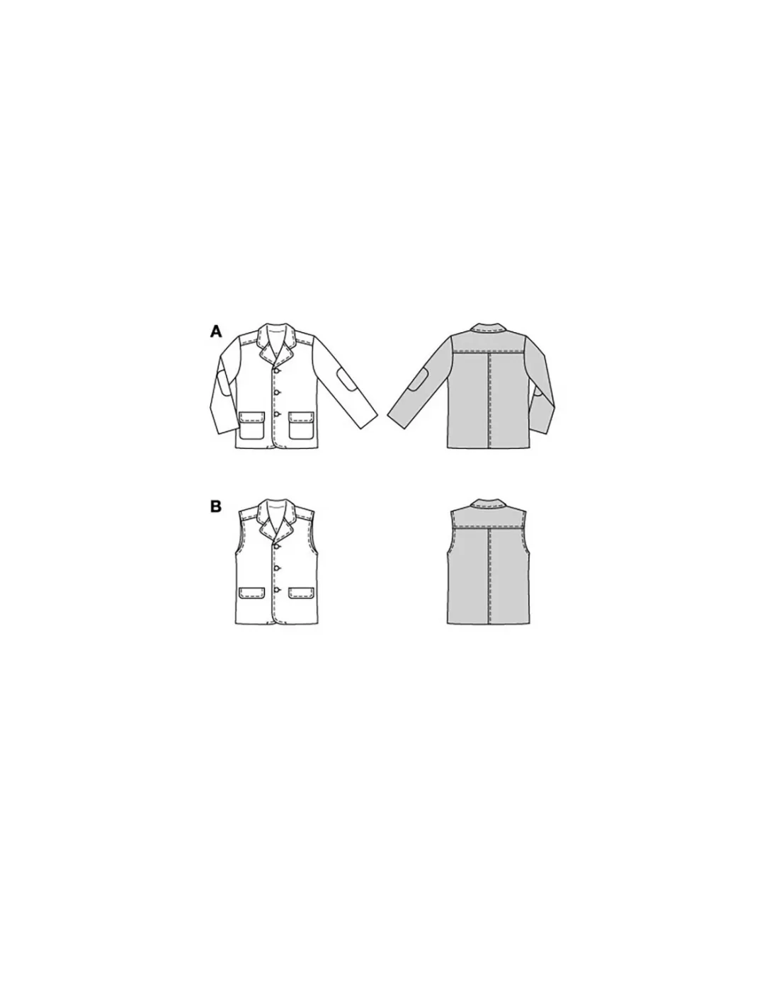 Ces deux variantes miniatures pour garçons sont la copie conforme des modèles homme. Avec l’élégante veste à revers et poches, les petits sont aussi bien habillés. Selon le choix de l'étoffe, la pièce est très chic ou plutôt cool. Il en va de même pour le gilet actuel sans manches.Velours côtelé, cotonnade, fibres mélangéesAB : entoilage thermocollant, 3 boutons. B : 1 paire de petites épaulettes.