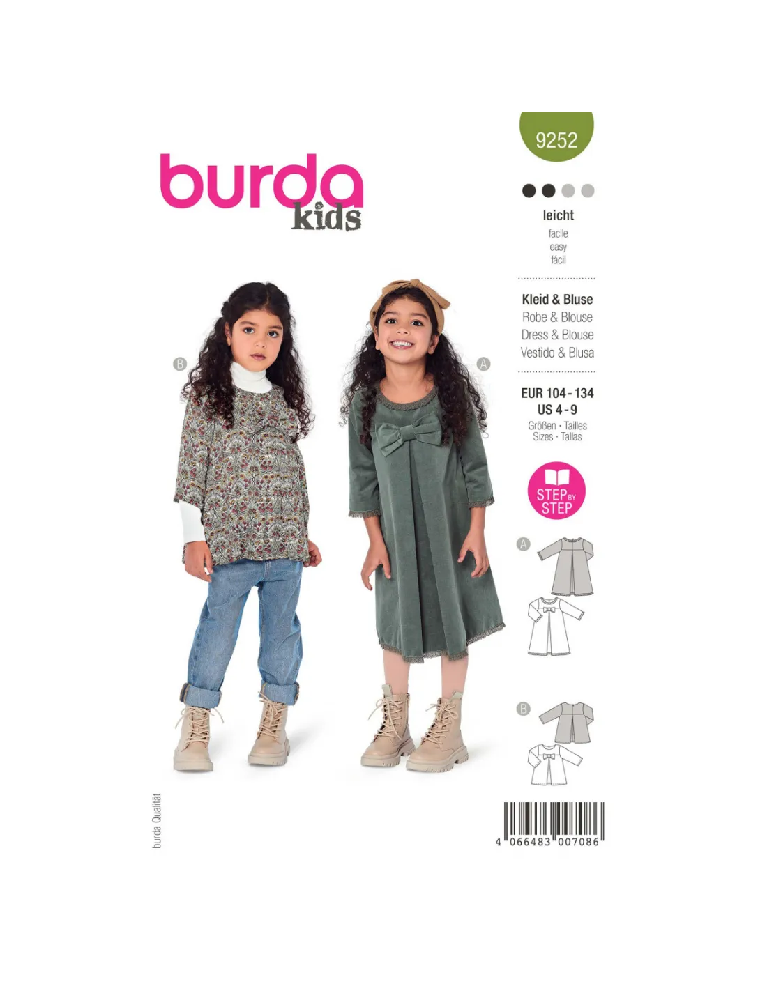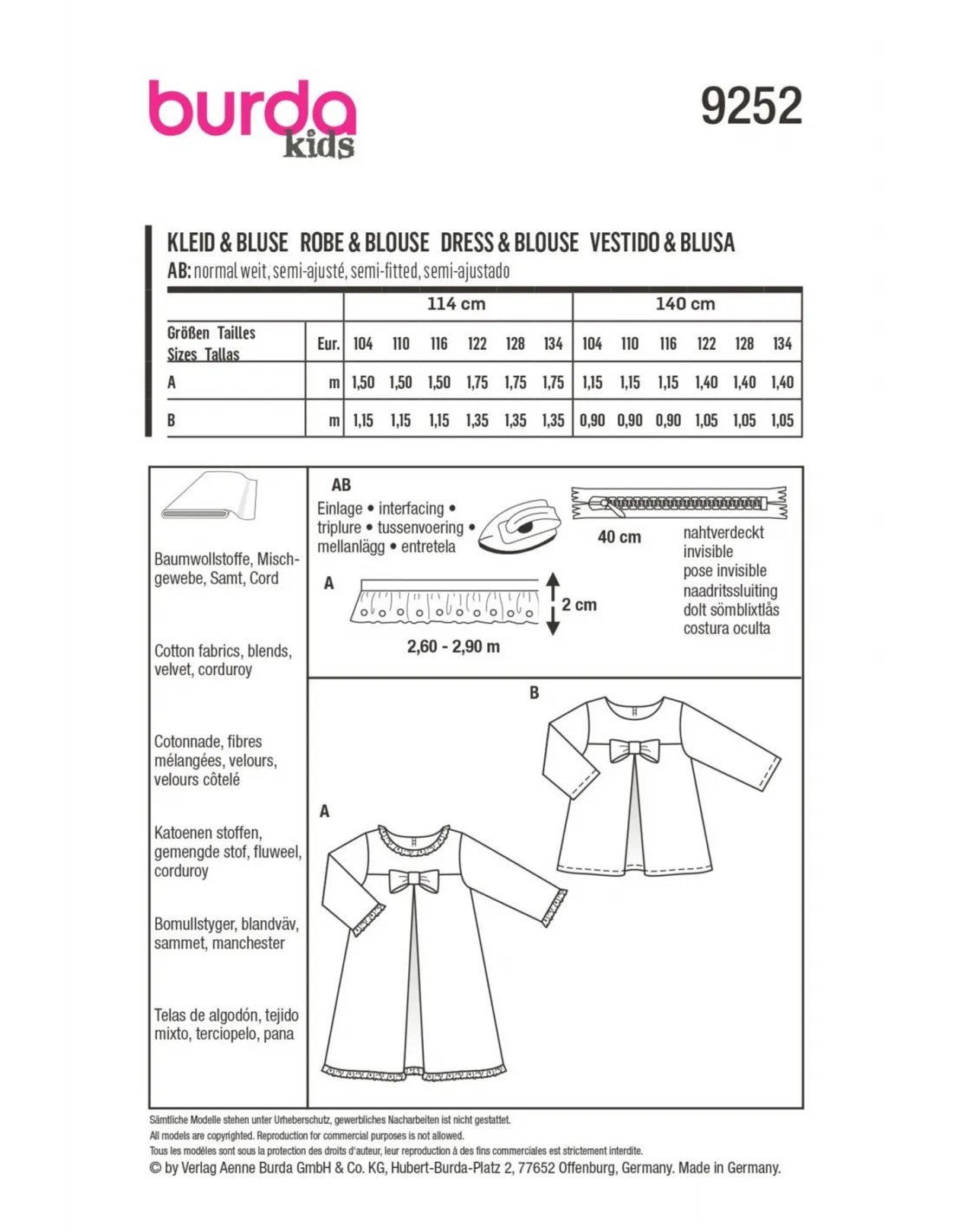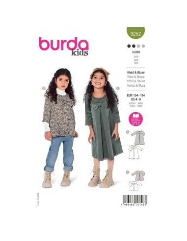 Robe ou blouse au choix, ces jolis modèles évasés raviront toutes les petites filles sages. Les plis profonds, formés sur le devant et le dos garantissent une grande liberté de mouvement et créent une belle ligne A. Une fermeture à glissière montée dans le milieu dos permet de mettre ou d'enlever facilement le vêtement.