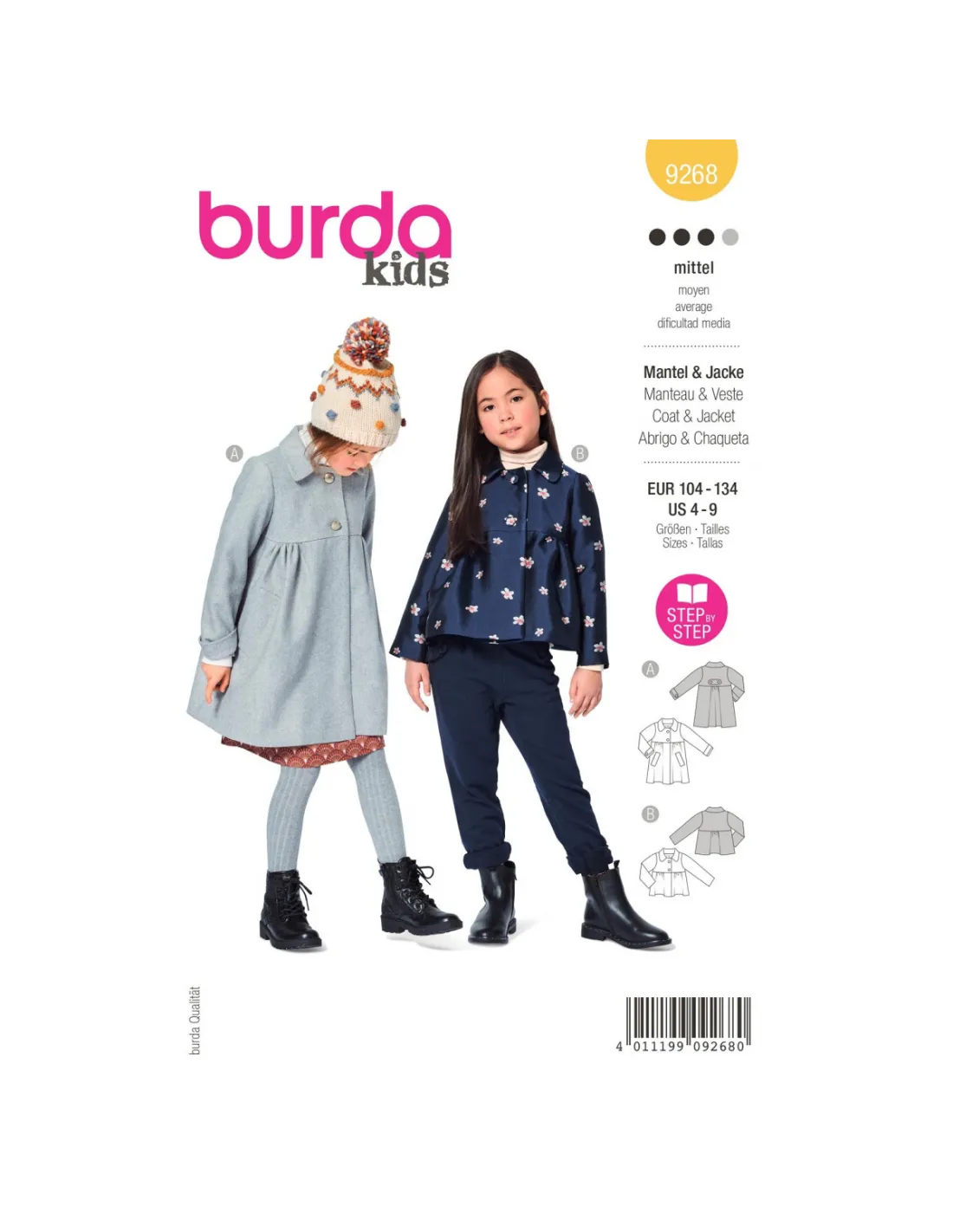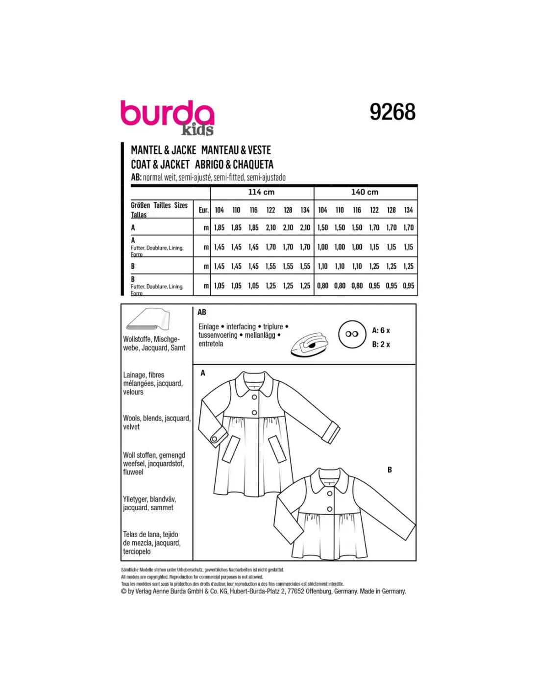 Patron Burda 9268 - Manteau, veste à col Claudine du 104 au 134
