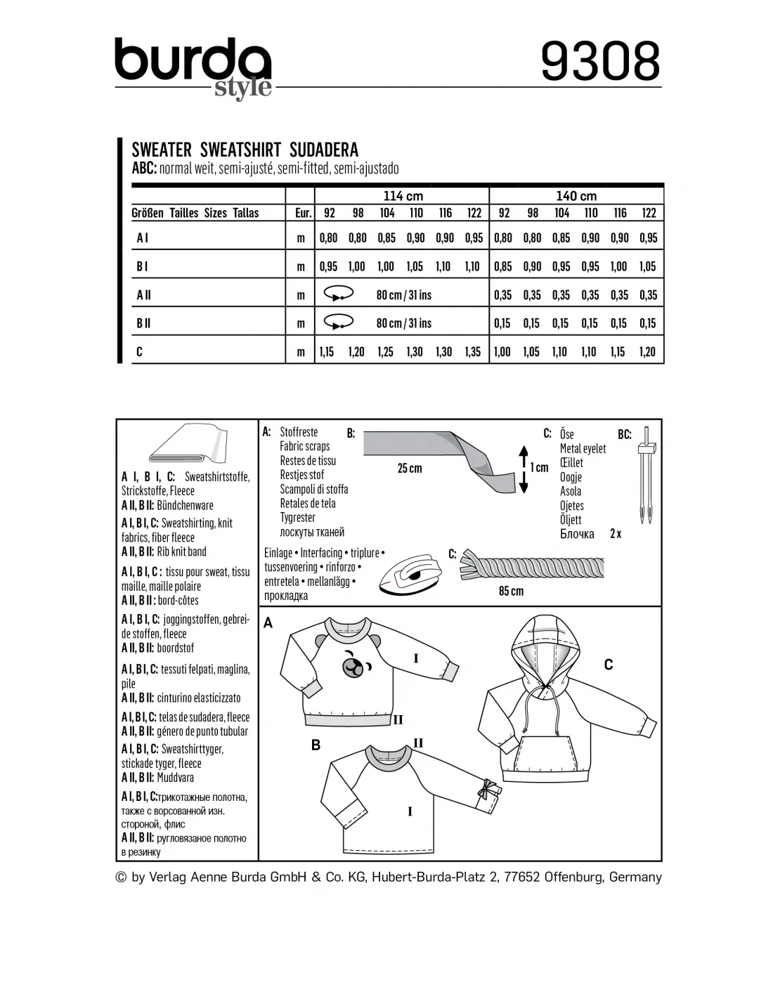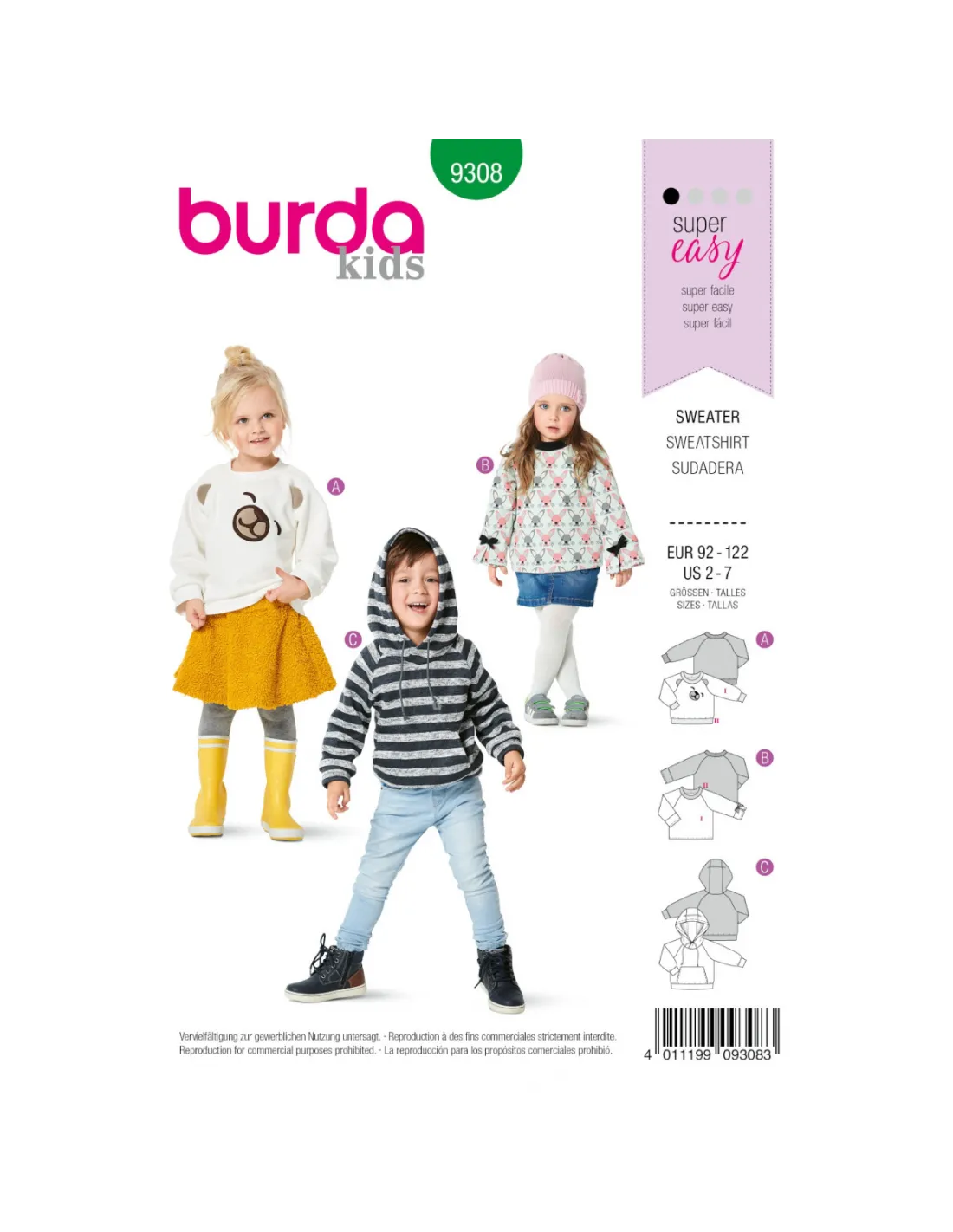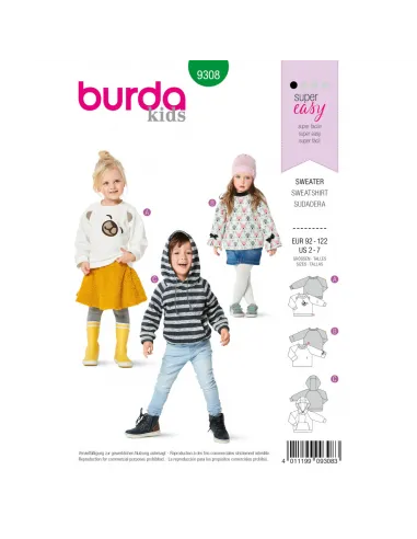 Patron Burda 9308 SweaTee-Shirt hoodie de 2 à 7 ans