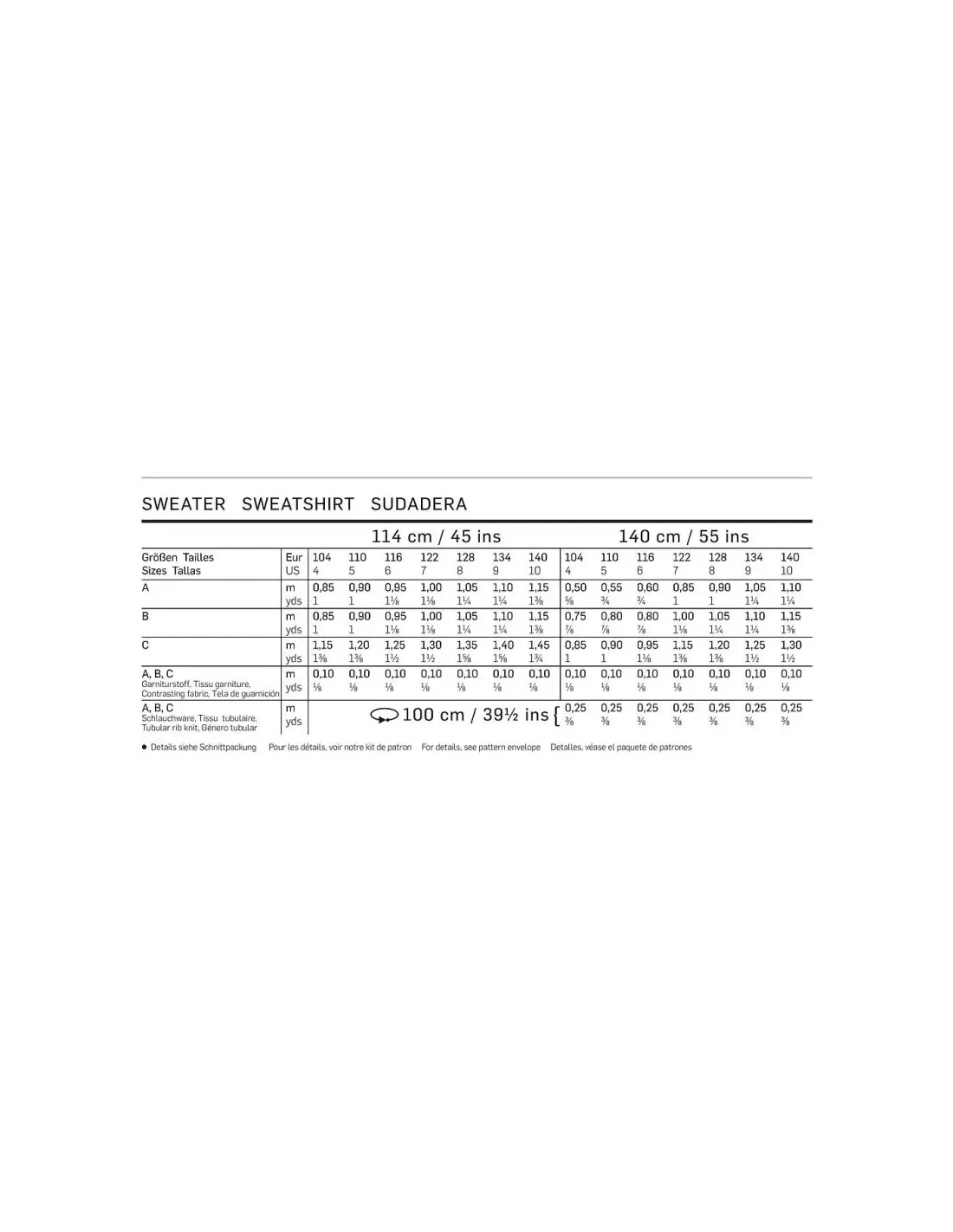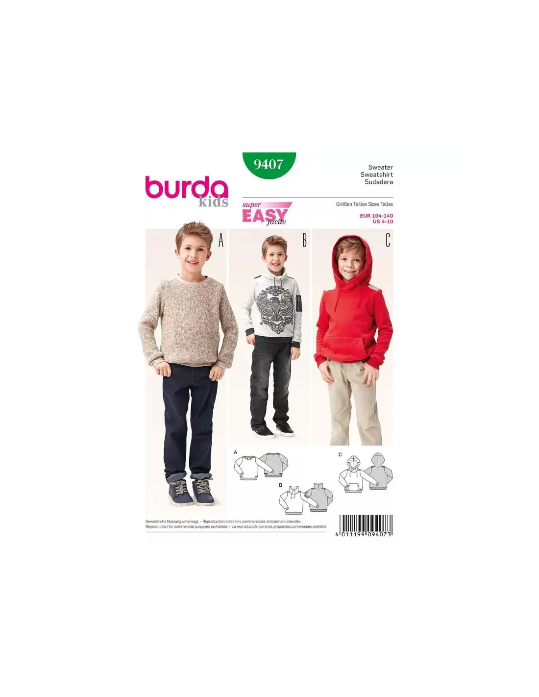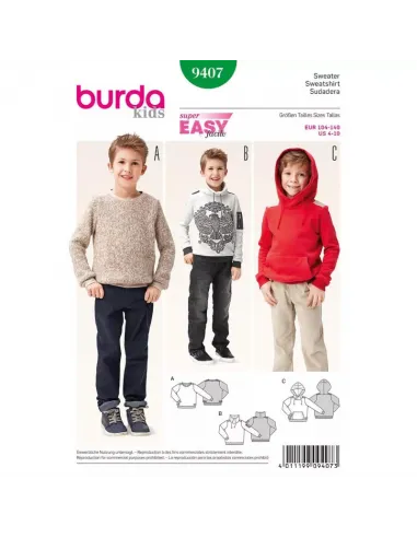 Sweat-shirtNiveau couture: super facile - rapide - Ideal pour commencer Tailles 104, 110, 116, 122, 128, 134, 140cm (4 ans - 10 ans)Les pièces favorites de la saison, le resteront encore longtemps. Réalisez soit le pull à parements, le sweat-shirt à col droit ou le hoodie à capuche et poche appliquée sur le devant. Des détails sportifs complètent le look. Tissu(s) conseillé(s): jersey molletonné, tissu maille, laine polaire Tissu de garniture: nylon, popeline. Langues incluses: Français, Deutsch, English, Español, Nederlands, Italiano, Svenska, Dansk, Pусский.