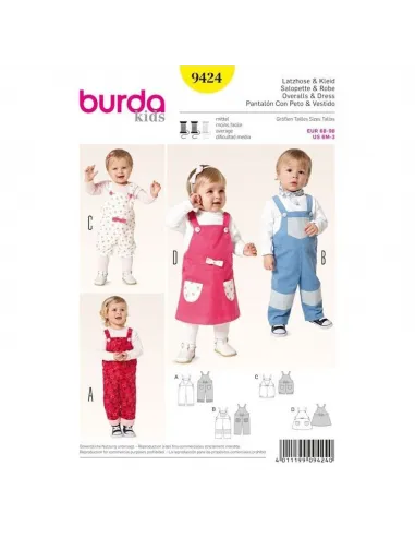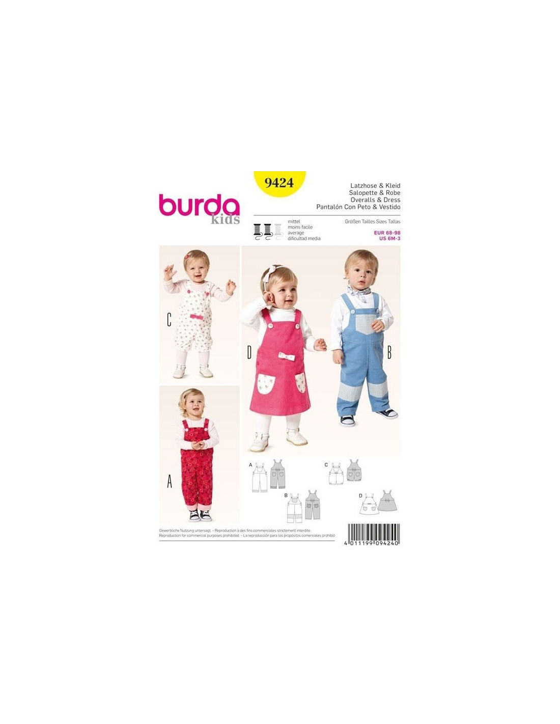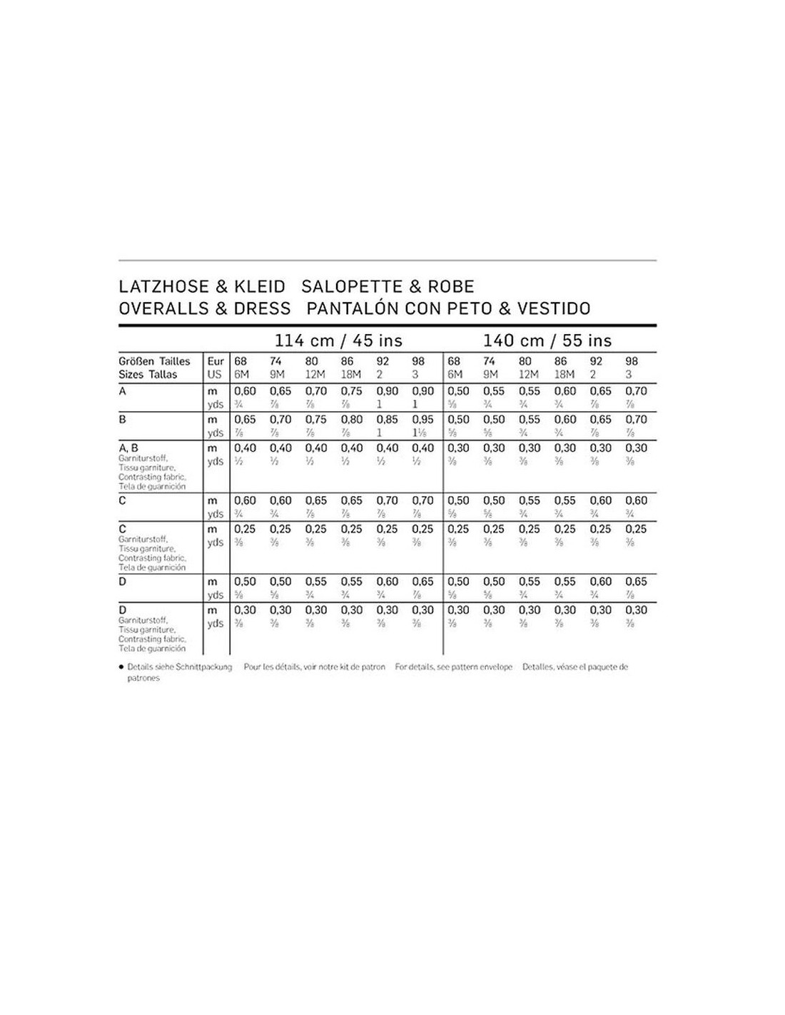 Salopette & robe enfant. Tailles: 68 - 98cm (6 mois - 3 ans)Niveau de couture: moyen-intermédiaire. Tissus conseillés: tissus en coton, côtelé milleraies, tissus jean légers. Langues incluses: Français, Deutsch, English, Español, Nederlands, Italiano, Svenska, Dansk, Pусский.