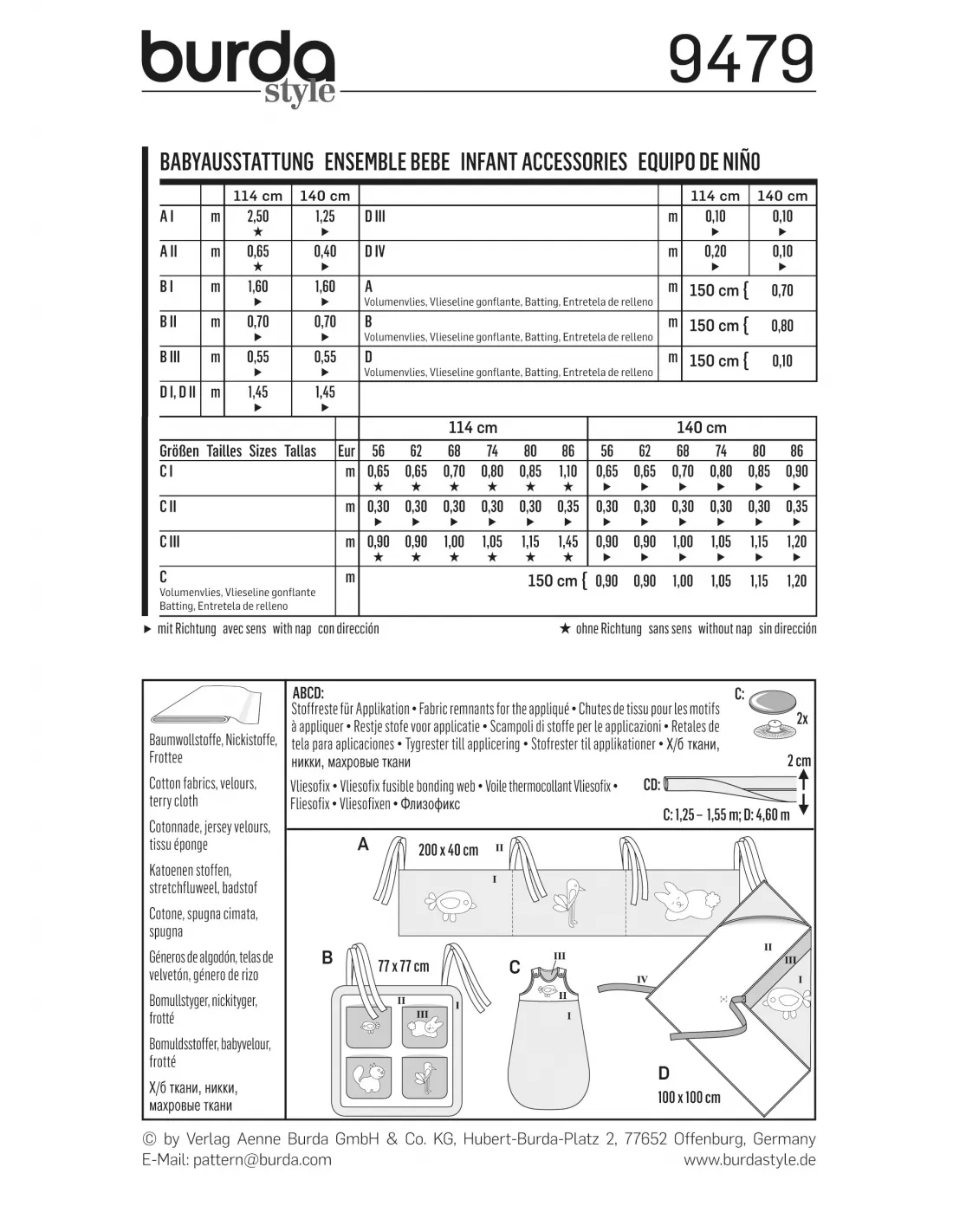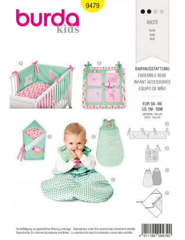 Ensemble bébéTailles: 56 - 86cm (1 mois à 18 mois)Niveau de couture: facile. Tissus conseillés: tissus en coton, velours éponge, éponge velours. Langues incluses: Français, Deutsch, English, Español, Nederlands, Italiano, Svenska, Dansk, Pусский.