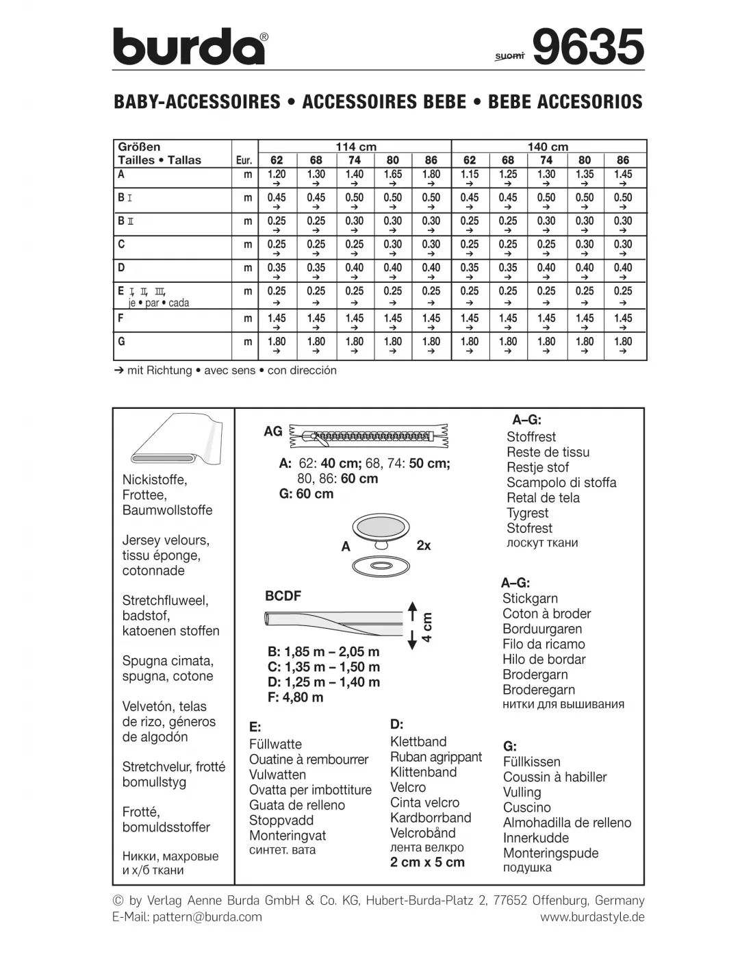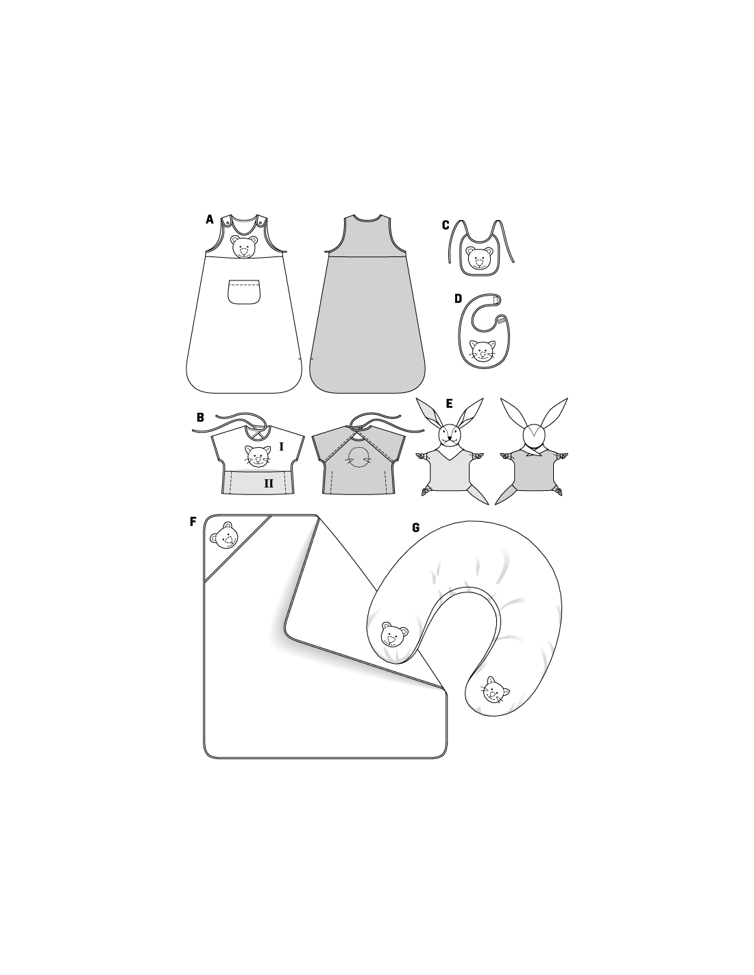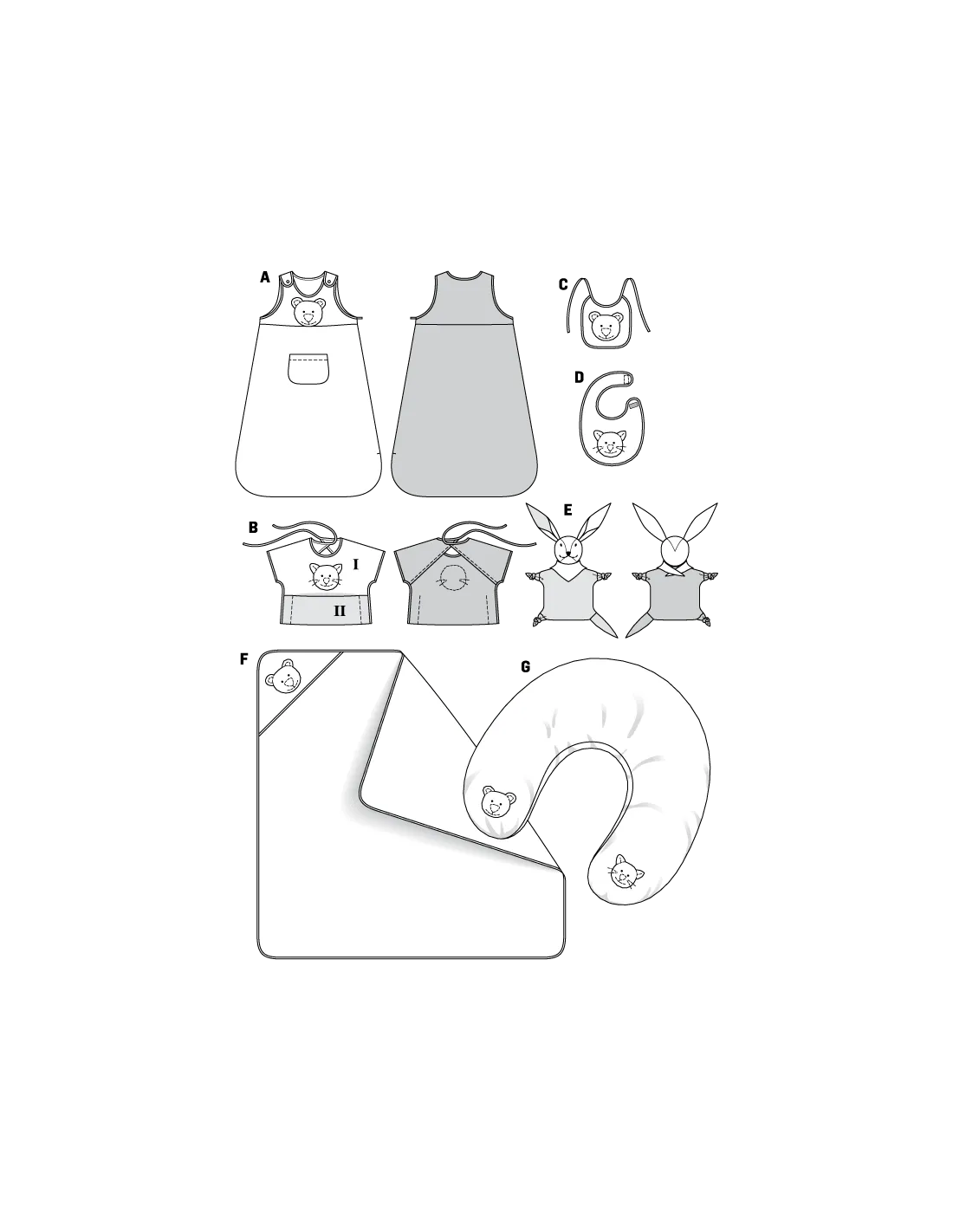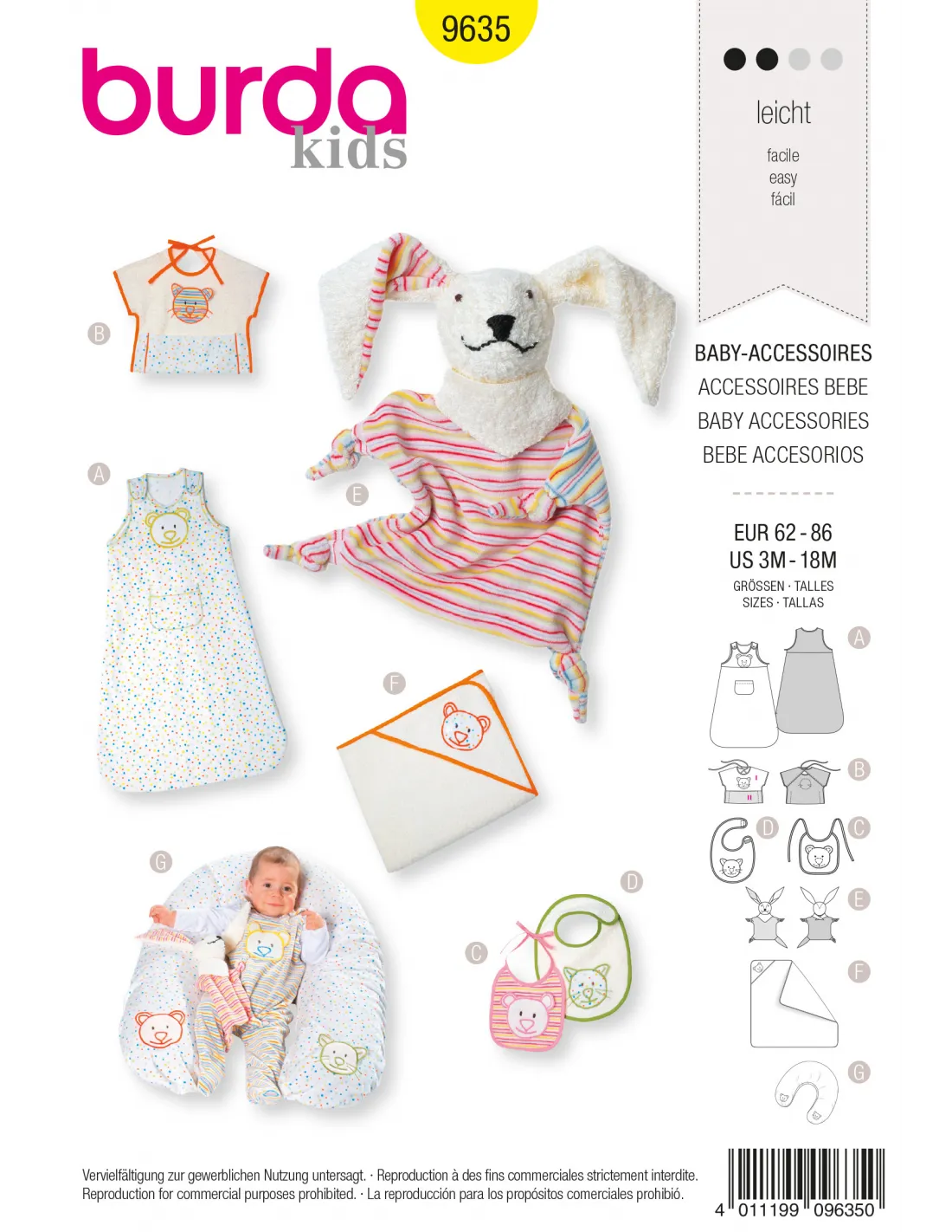 Accessoires bébéTailles: 62 - 86cm (3 mois - 18 mois)Niveau de couture: facile. Pour la venue de bébé, gigoteuse, sortie de bain, coussin cale-bébé, bavoir et doudou (lapin) sont déjà prêts. Le tout rehaussé de tendres applications. Tissu(s) conseillé(s): Velours éponge, tissu éponge, cotonnade. Langues incluses: Français, Deutsch, English, Español, Nederlands, Italiano, Svenska, Dansk, Pусский.
