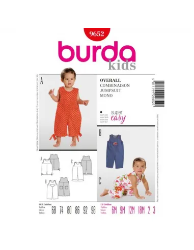 Salopettes avec pantalon rapporté, fermées par des bretelles à l’empiècement. Tailles : 68 - 98cm (6mois à 3 ans)Niveau de couture : super facile - idéal pour commencer A: de longueur 3/4, resserrée par des liens aux jambes. B: à jambes longues, elle arbore une poche plaquée ventrale et des poches dans le dos. C: garnie de volant au bas des jambes. Tissu(s) conseillé(s): Cotonnade, légère toile de jean. Langues incluses: Français, Deutsch, English, Español, Nederlands, Italiano, Svenska, Dansk, Pусский.