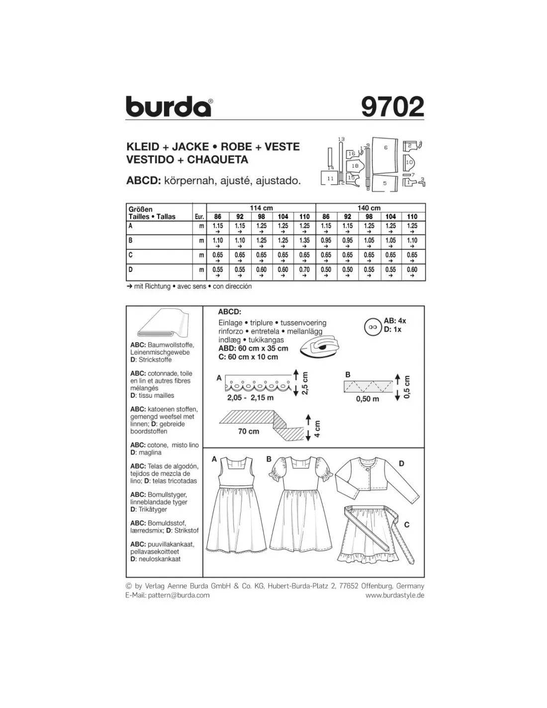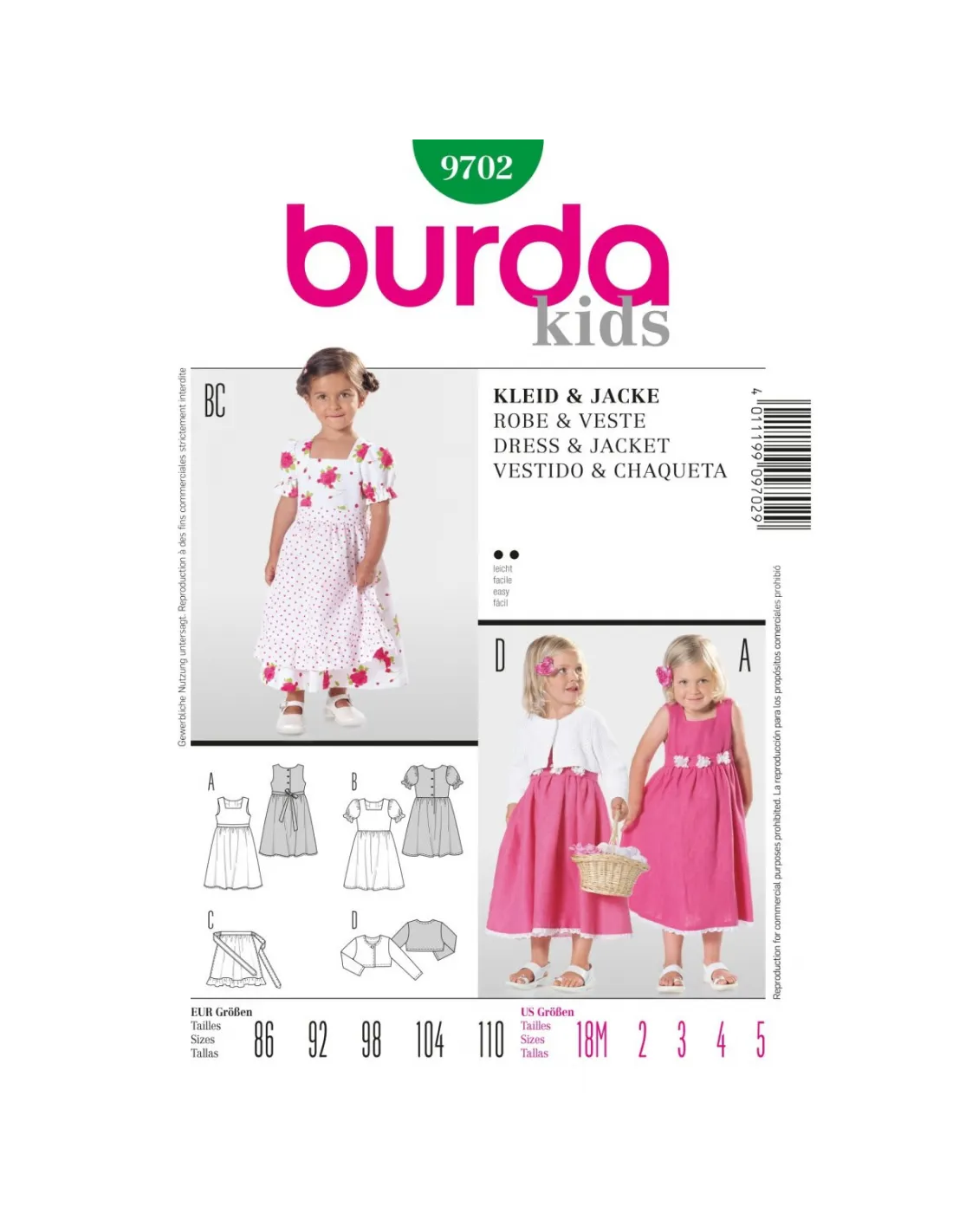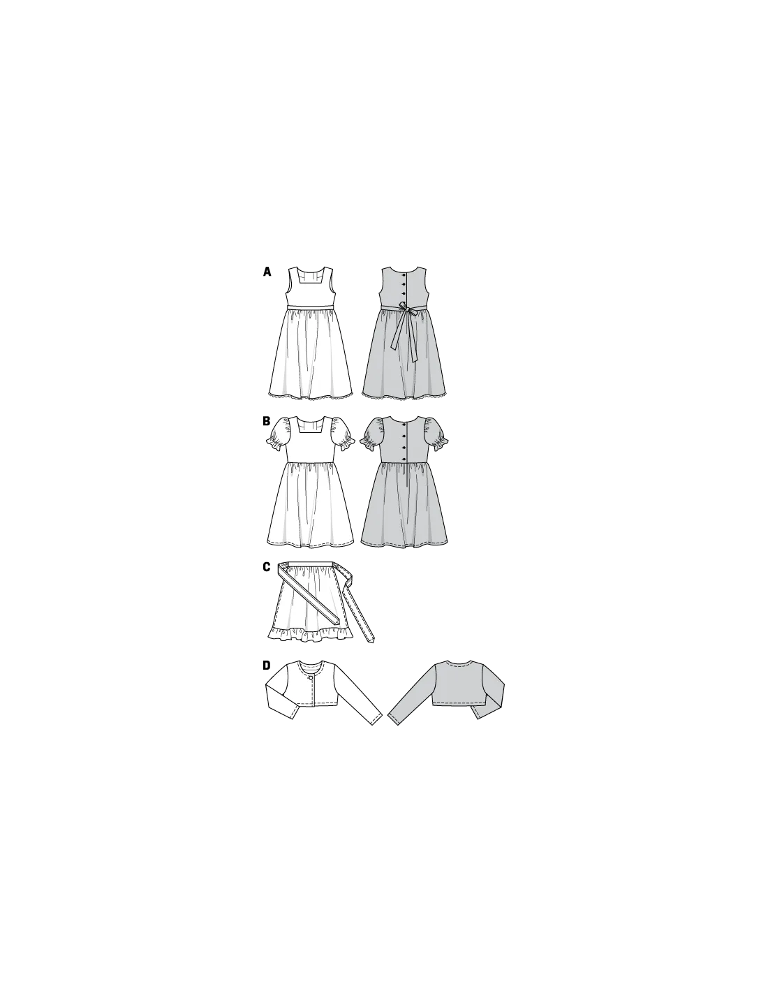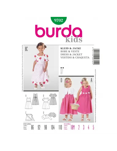 Robes et veste boutonnées dans le dos - enfant Niveau de couture: facileTailles : 86 - 110 cm (18 mois - 5 ans)Robe paysanne sans manches (A), rehaussée d’un ruban à nouer, de fleurs contrastantes et d’un volant à l’ourlet. Robe B: à manches ballon. Combinée au tablier C, elle donne une adorable tenue folklorique. Pratique et chaude par temps froid, la petite veste courte D en tissu maille. Tissu(s) conseillé(s): ABC: cotonnade, lin mélangé D: tissu maille. Langues incluses: Français, Deutsch, English, Español, Nederlands, Italiano, Svenska, Dansk, Pусский.