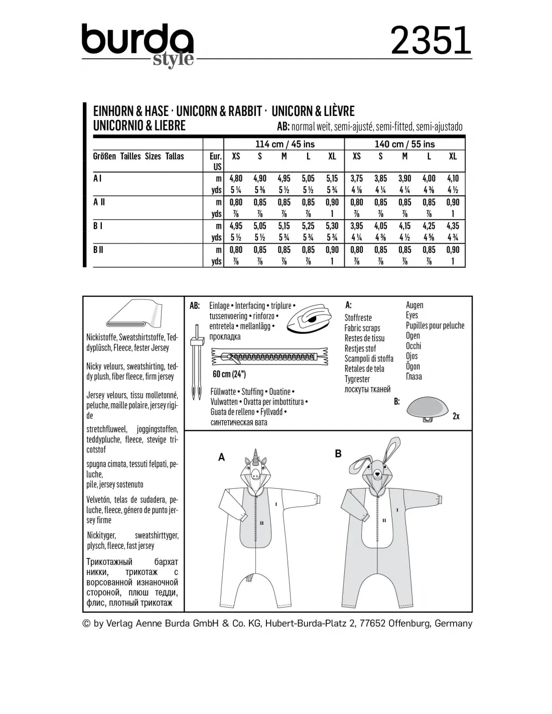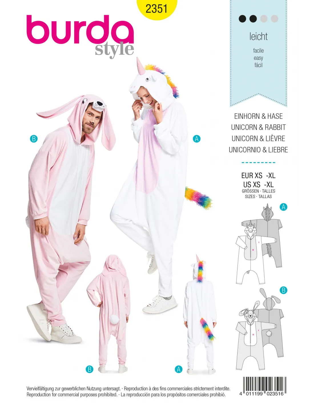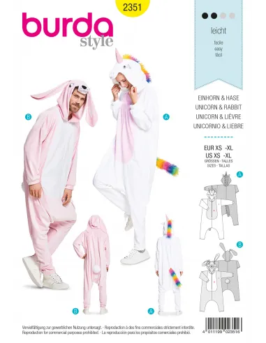 Patron Burda Carnaval 2351 - Combinaison lapin et Licorne Adulte