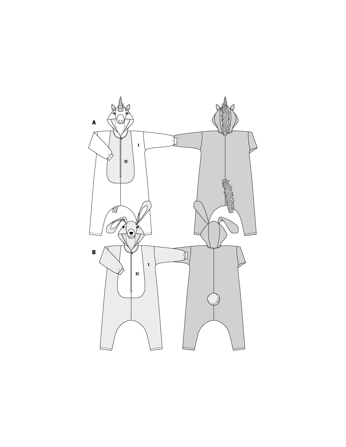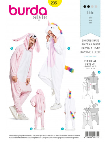 Burda CarnavalCombinaison pour Elle et Lui : Licorne - Lapin Taille FR : dames de 32 à 50 (XS à XL) homme de 44 à 56 (XS à XL)Niveau de difficulté : facile Tissus conseillés : Jersey velours, tissu pour sweatshirt, peluche, maille polaire, jersey rigideLangues incluses : Français, Deutsch, English, Español, Nederlands, Italiano,Svenska, Dansk, Pусский