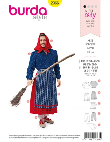 Burda CarnavalSorcière -modèle de couple Chemise - jupe - tablier - pantalon -foulard Niveau couture: Super Facile, rapide, idéal pour débutant Le costume traditionnel de sorcière, autant destiné aux femmes qu'aux hommes, se compose d'une chemise simple à petite fente et encolure gansée, associée à une jupe élastiquée ample et un tablier assorti. Le tout se porte sur une culotte blanche en tissu brodé. Un foulard triangulaire assorti apporte la touche finale. Tissu(s) conseillé(s): ABCE: cotonnade D: tissu brodé festonné sur un bordLangues incluses: Français, Deutsch, English, Español, Nederlands, Italiano,Svenska, Dansk, Pусский