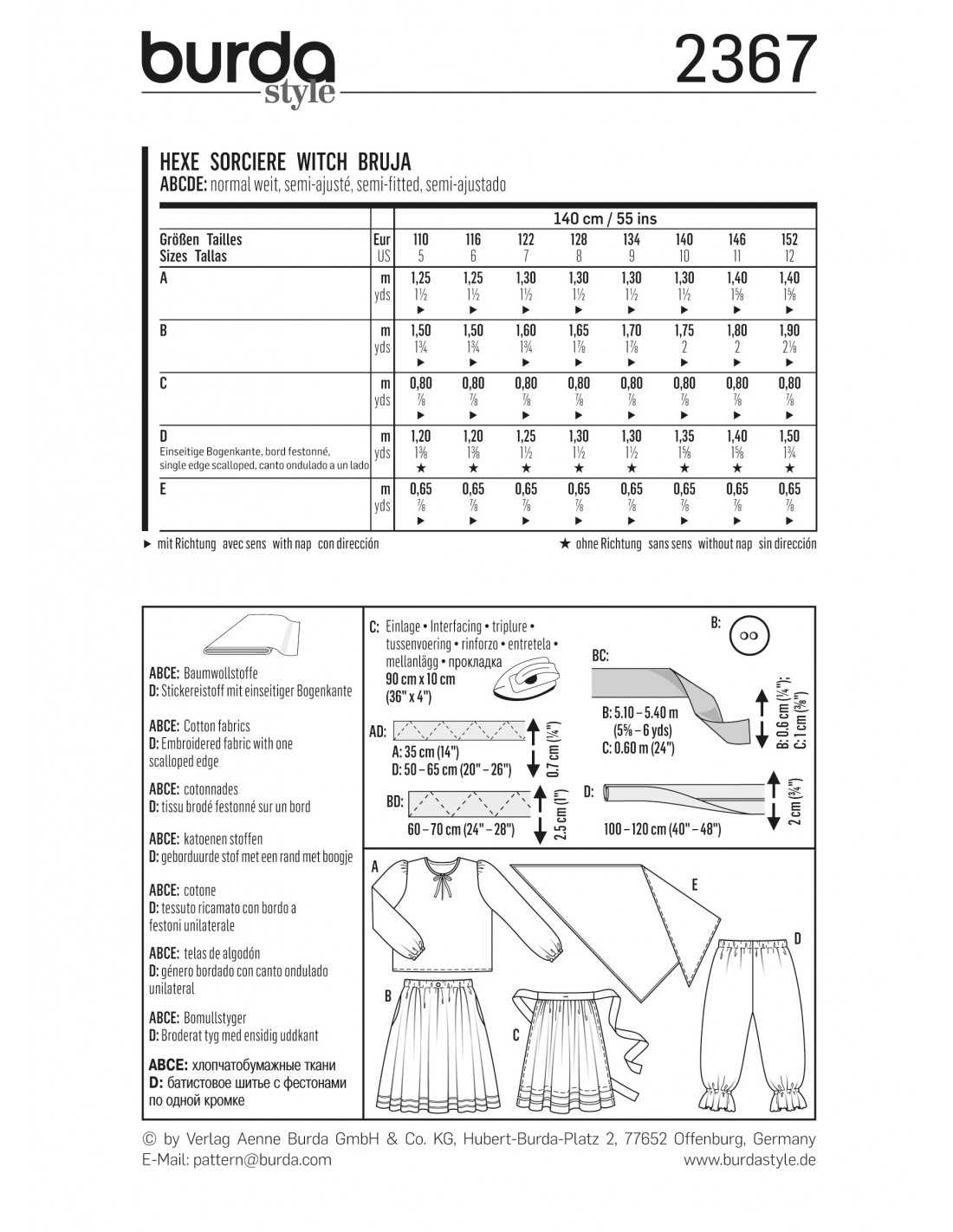 Burda CarnavalSorcière Chemise jupe tablier pantalon foulard Niveau couture: Super Facile, rapide, idéal pour débutant Tailles fille 110 à 152 cm (5 à 12 ans)Le costume traditionnel de sorcière se compose d'une chemise simple à petite fente et encolure gansée, associée à une jupe élastiquée ample et un tablier assorti. Le tout se porte sur une culotte blanche en tissu brodé. Un foulard triangulaire assorti apporte la touche finale. Coupez le patron en prévoyant l'aisance suffisante pour pouvoir s'habiller bien chaudement en-dessous.Tissu(s) conseillé(s): ABCE: cotonnade | D: tissu brodé festonné sur un bordLangues incluses: Français, Deutsch, English, Español, Nederlands, Italiano,Svenska, Dansk, Pусский