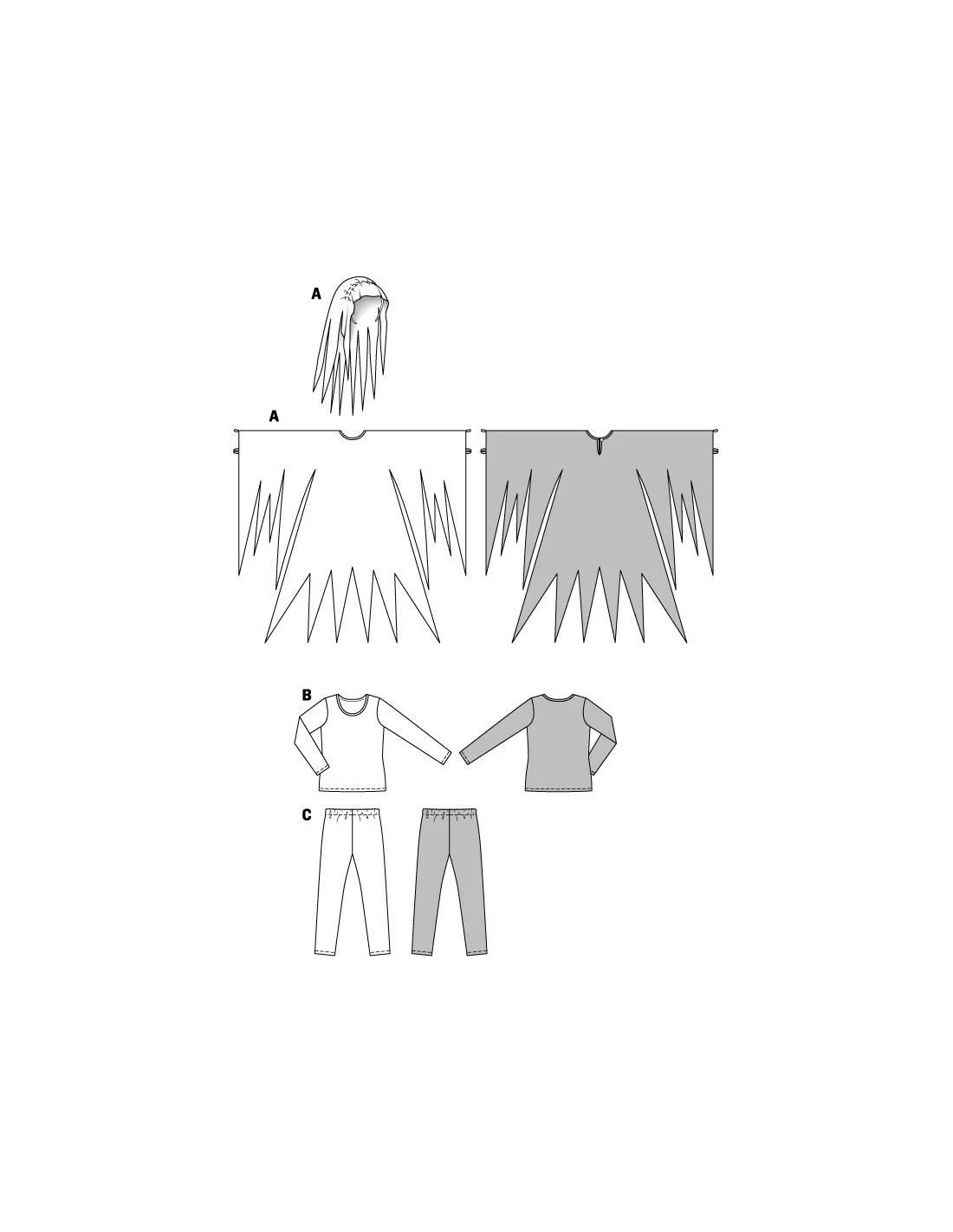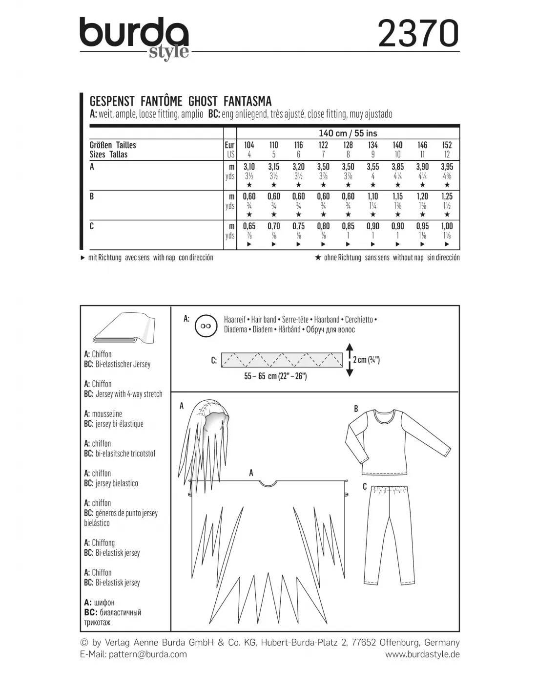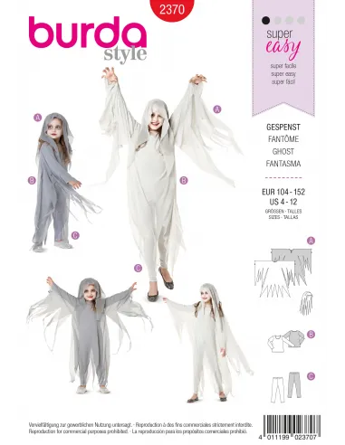 Burda CarnavalFantômeNiveau couture: Super Facile, rapide, idéal pour débutantTailles 104 à 152 cm (4 à 12 ans)Des petits fantômes font leur apparition pour Carnaval. La cape dentellée avec couvre-tête assortie met tout de suite dans l’ambiance. T-shirt et leggins se portent en dessous.Une fête frénissante peut commencer.Tissus conseillés:A: ChiffonBC: Jersey bi-élastiqueLangues incluses: Français, Deutsch, English, Español, Nederlands, Italiano,Svenska, Dansk, Pусский