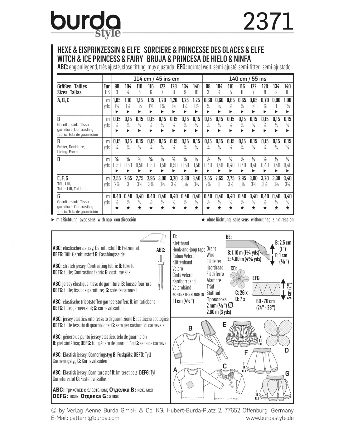 Burda CarnavalSorcière - Princesse des neiges - FéeTop - Jupe tulle - ailesNiveau couture: Super Facile, rapide, idéal pour débutantTailles enfant: 98 à 140 cm (3 à 10 ans)Langues incluses: Français, Deutsch, English, Español, Nederlands, Italiano,Svenska, Dansk, Pусский