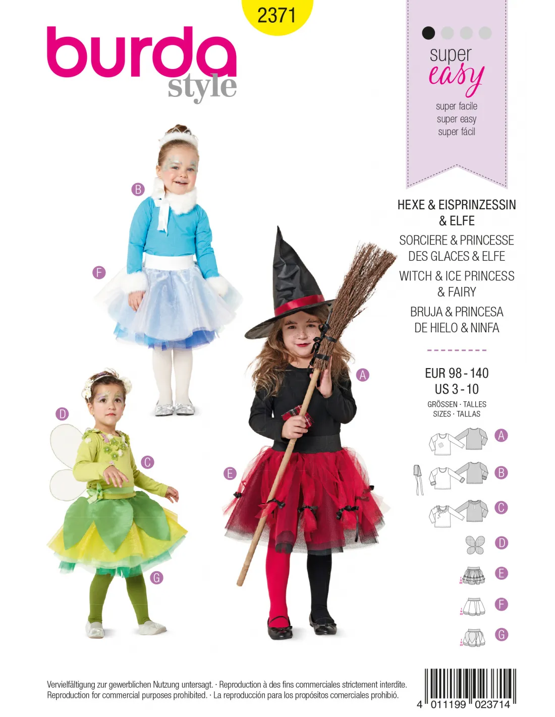 Patron Burda Carnaval 2371 - Déguisement de Sorcière, princesse des glaces et Elfe enfant