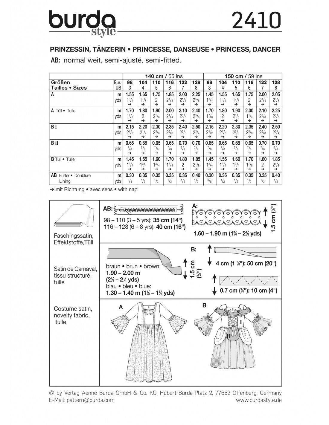 Burda CarnavalDes modèles féeriques qui enthousiasment les petites filles ! Le modèle A est une robe de rêve pour petites princesses. Cette robe a un parement d’encolure drapé, des bordures décoratives et une longue jupe en double épaisseur. Le modèle B danse aux mollets. Ses parements d’encolure et d’épaules se drapent, il se pare de jolis rubans et de drapés au niveau des hanches. Les deux robes affichent des volants aux manches. Conseil d’étoffe: Satin de carnaval, tissus à effets, tulleTailles 98 à 128cm (3 à 8 ans)Langues incluses: Français, Deutsch, English, Español, Nederlands, Italiano,Svenska, Dansk, Pусский