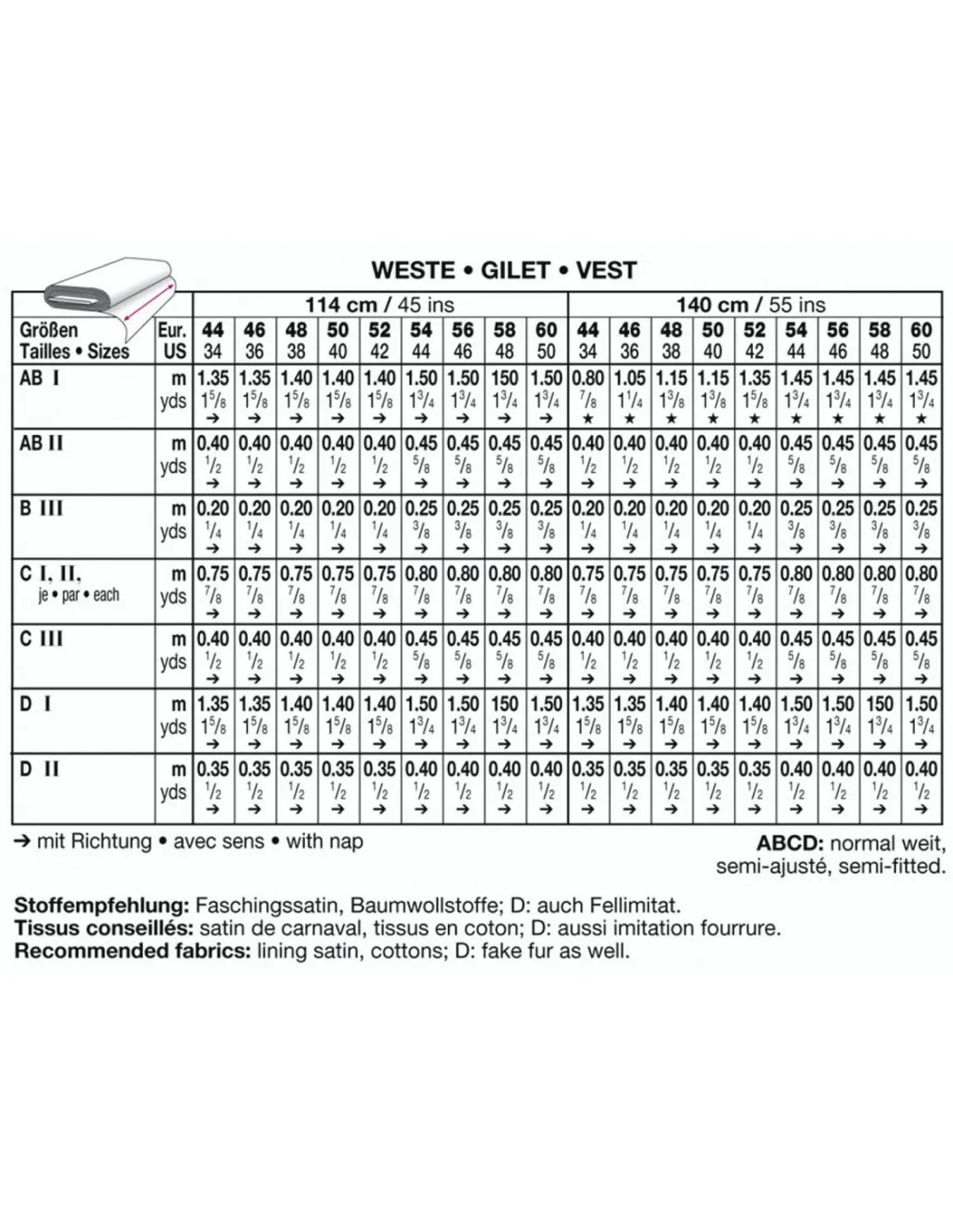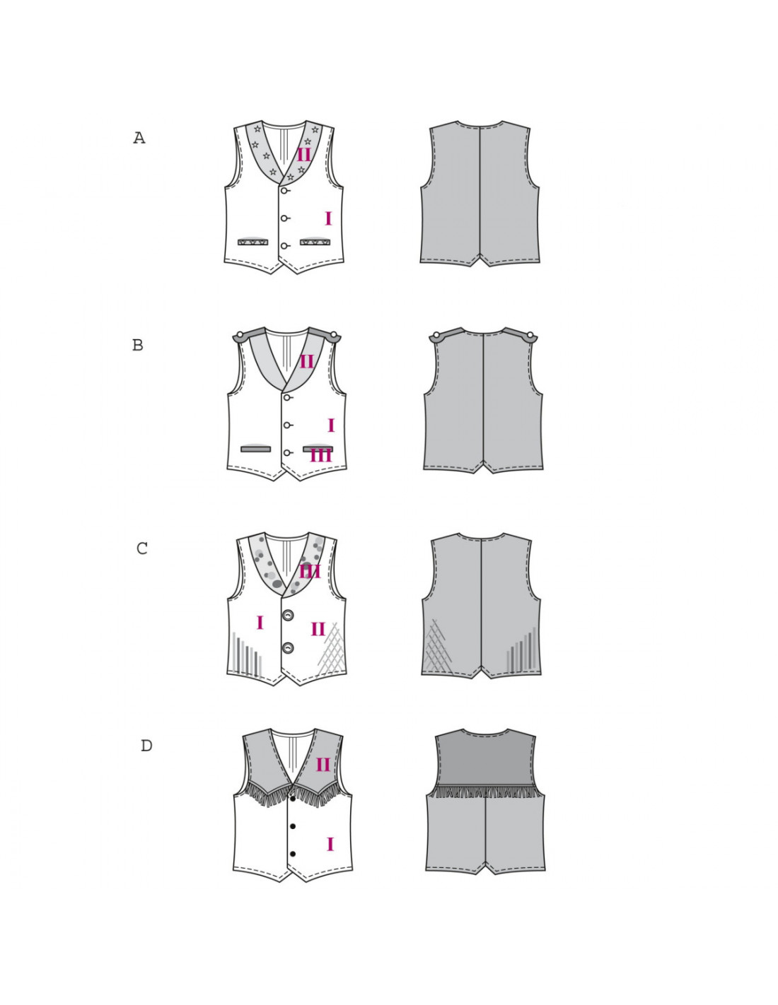 Burda CarnavalVestes gilets Cowboy, Clown, Oncle SamNiveau couture: Super Facile, rapide, idéal pour débutant Tailles 44 à 60. Gilet sans mache, basique à adapter à de nombreux thèmes de carnaval. Du cow-boy au barman en passant par le magicien, laissez-vous inspirer! Un chapeau adéquat, un peu de maquillage et le tour sera joué! Tissu(s) conseillé(s): Satin, tissus de coton, pour D: imitation fourrureLangues incluses: Français, Deutsch, English, Español, Nederlands, Italiano,Svenska, Dansk, Pусский