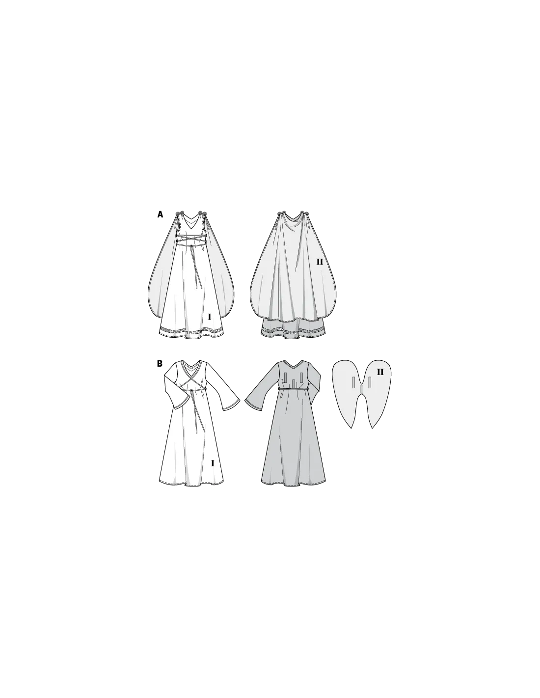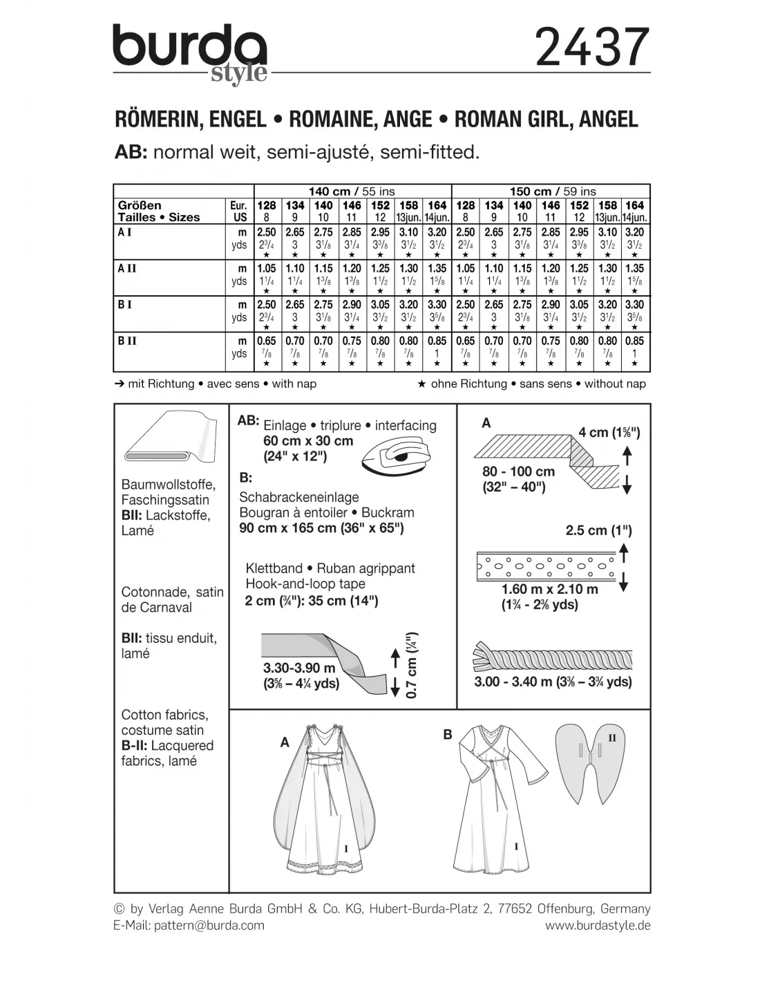 Burda CarnavalAB: ampleur normale. Robe sans manches ornée d'un laçage pour le costume de romaine A la cape est tout simplement saisie dans les coutures d'épaule. Robe à manches longues évasées et ornée de galons dorés pour l'ange B les ailes, fixées dans le dos avec du ruban agrippant, sont amovibles. Tissus conseillés: cotonnade, satin pour costume de Carnaval B II: tissu enduit, laméLangues incluses: Français, Deutsch, English, Español, Nederlands, Italiano,Svenska, Dansk, Pусский