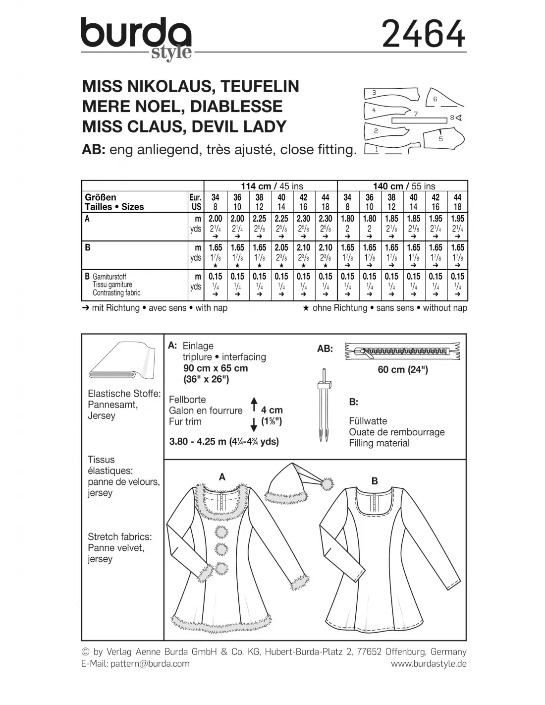 Burda CarnavalAB: ajustés par des découpes, bord d’ourlet très évasé, décolleté profond. A: Tenue coquine pour Mère Noël, bordée de fourrure et complétée d’un bonnet pointu.B: Robe infernale toute noire pour la diablesse, ou blanche et ornée d’une croix rouge pour l’infirmière. Le patron 2451 propose un chapeau assorti. Tissus conseillés: tissus qui s’étirent: panne de velours, jersey Tailles: 34 à 44Langues incluses: Français, Deutsch, English, Español, Nederlands, Italiano,Svenska, Dansk, Pусский