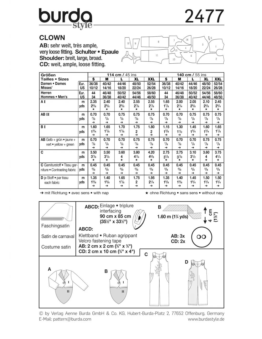 Burda CarnavalAB: très amples CD: amples Salopettes proposées en deux longueurs, à porter avec le frac A, ou le gilet B, tous deux coupés dans quatre tissus différents. Tissus conseillés: satin pour costume de Carnaval Niveau couture: Super Facile, rapide, idéal pour débutantTailles femme: 36/38 à 52/54Tailles homme: 44 à 58/60Langues incluses: Français, Deutsch, English, Español, Nederlands, Italiano,Svenska, Dansk, Pусский
