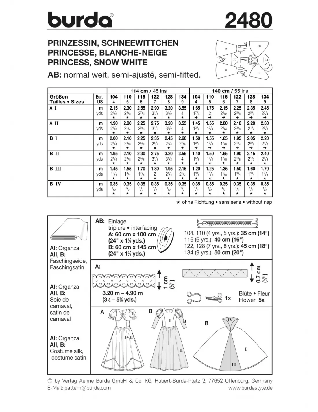 Patron Burda Carnaval 2480 - Déguisement Historique Princesse et Blanche - Neige enfant