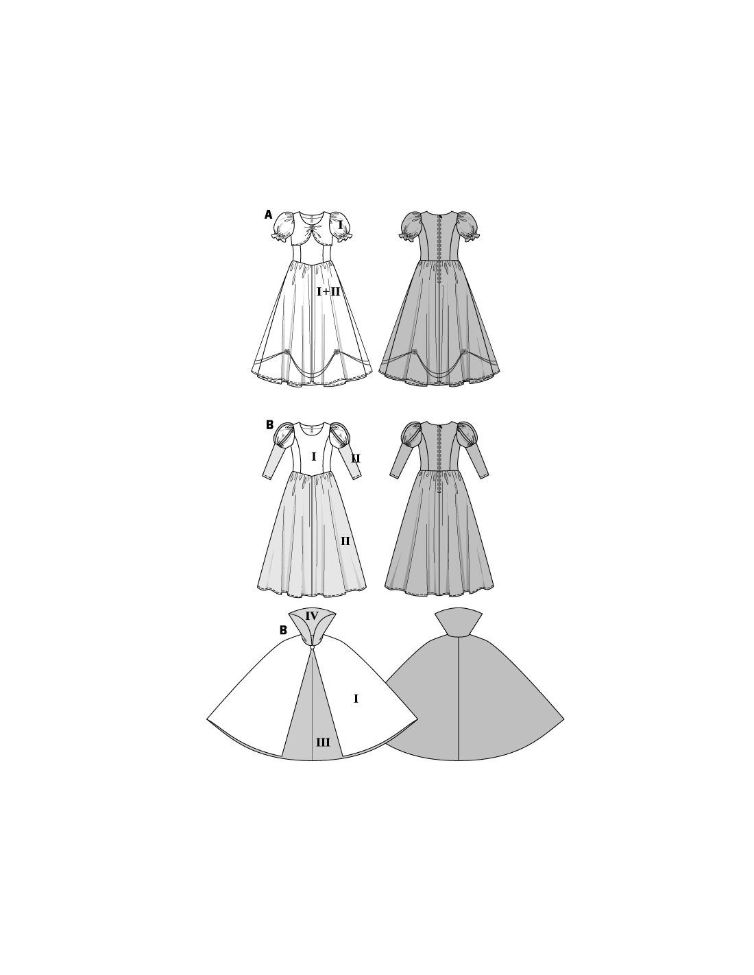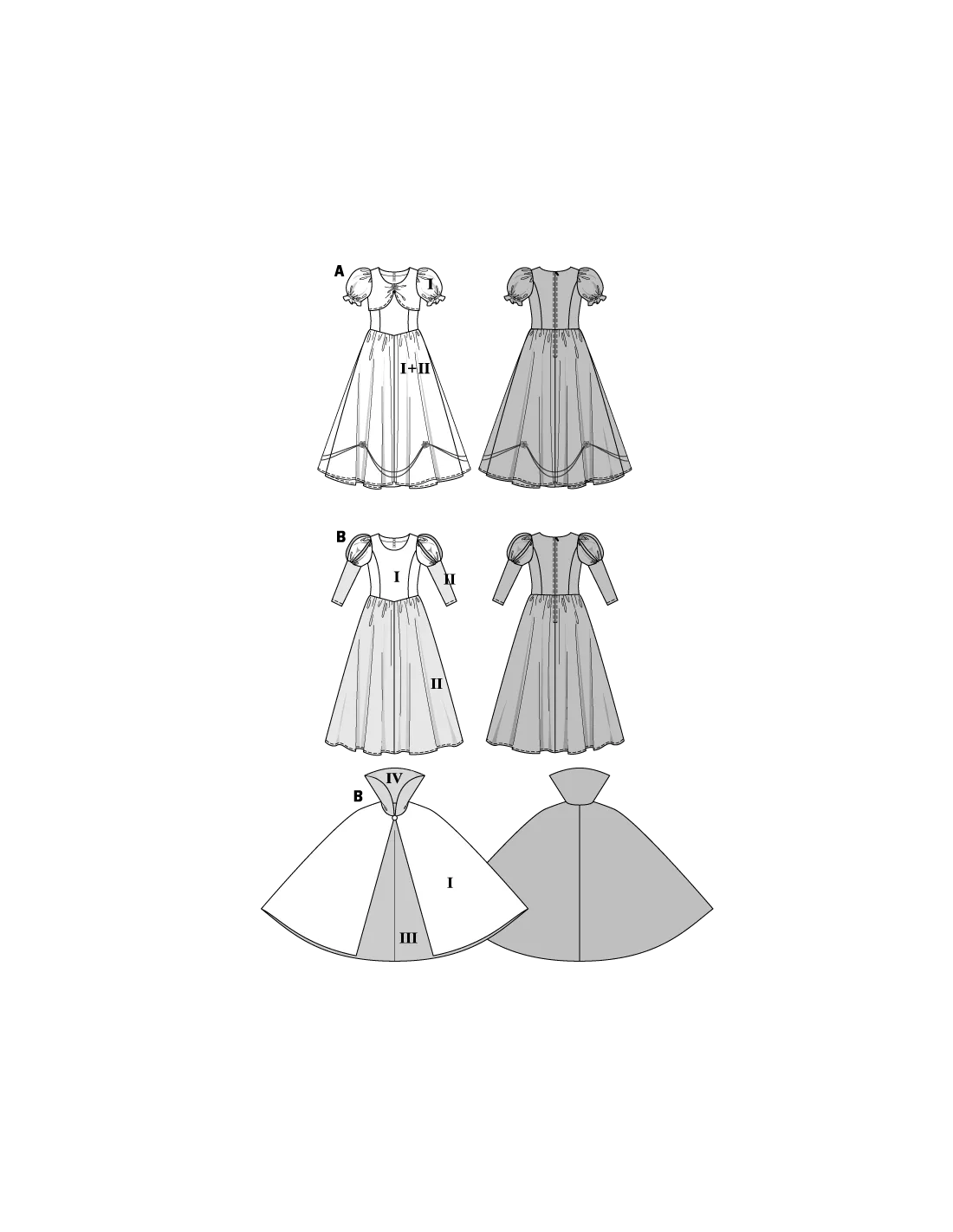 Burda CarnavalAB: ampleur normale pour cette robe à large jupe froncée, A: à manches courtes bouffantes et dessus de jupe en organza la robe est ornée de galons et de fleurs B: à manches bouffantes fendues cette variante est complétée d'une cape à col relevé. Tissus conseillés: A I: organza A II, B: satin ou soie pour costume de Carnaval. Tailles filles: 104 à 134 cm ( 4 à 9 ans)Niveau couture: facileLangues incluses: Français, Deutsch, English, Español, Nederlands, Italiano,Svenska, Dansk, Pусский
