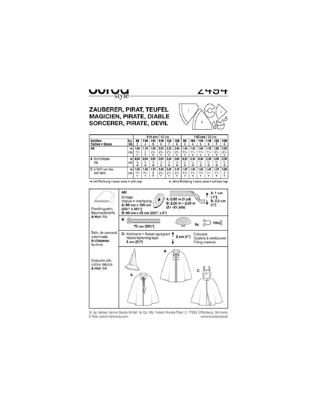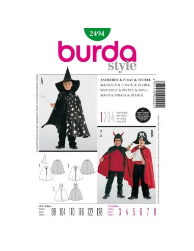 Patron Burda Carnaval 2494 - Déguisement Cape et Chapeau de Magicien, Pirate et Diable enfant