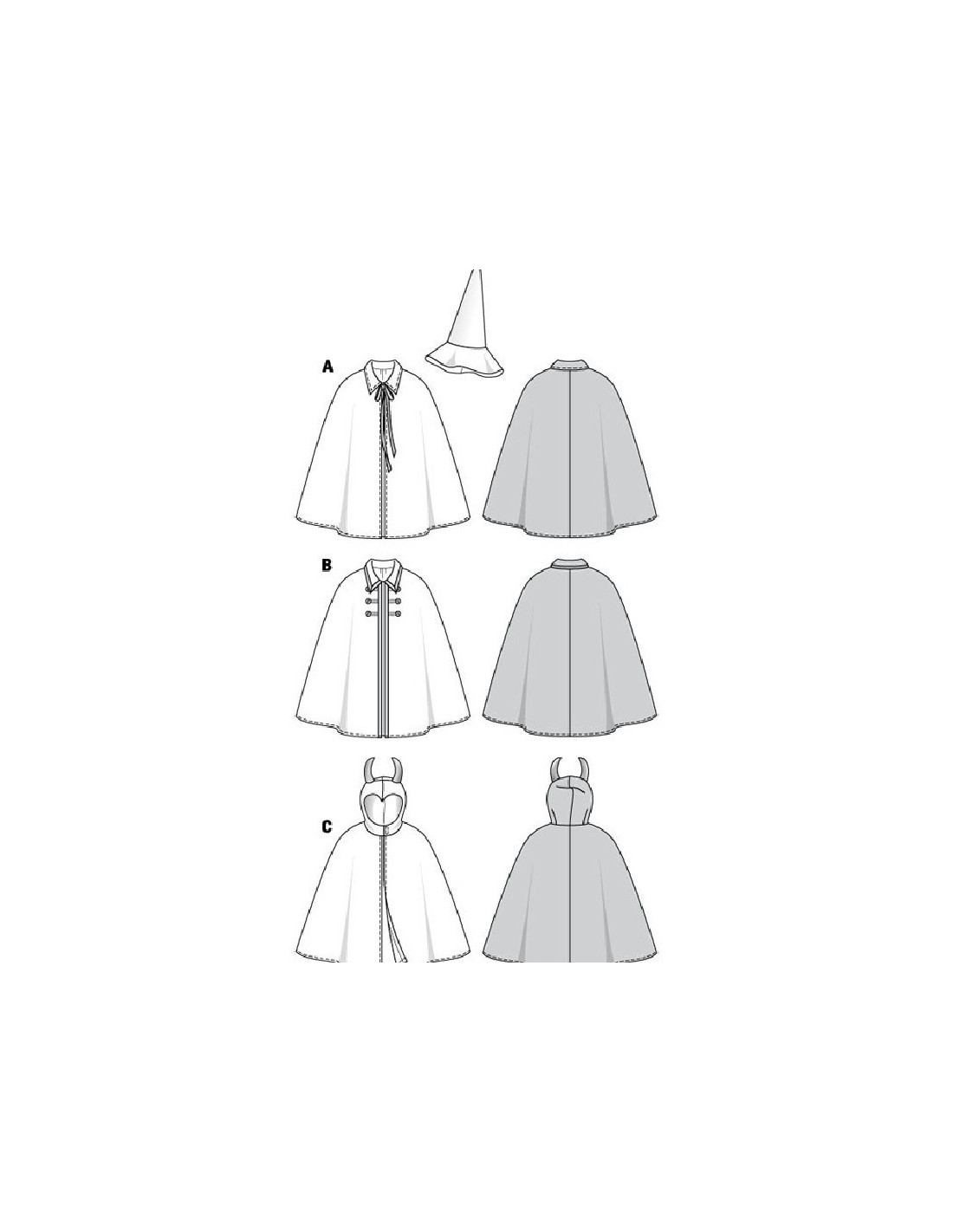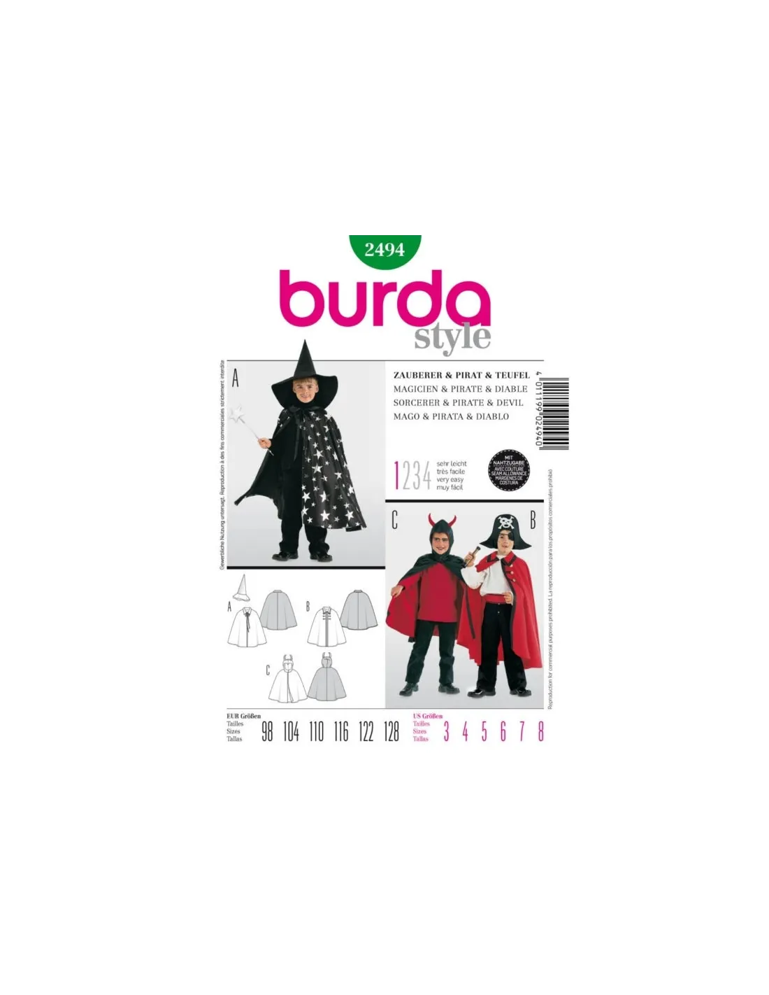 Burda CarnavalCape proposée en deux longueurs. A (Magicien): cape avec col et lien, complétée d?un chapeau pointu. B (Pirate): cape avec col et galons. C (Lucifer): cape doublée, avec capuchon et cornes. Niveau couture: Super Facile, rapide, idéal pour débutant Tailles 98, 104, 110, 116, 122, 128 (3 à 8 ans)Tissus conseillés: satin pour costume de Carnaval, cotonnade A chapeau: feutrine Langues incluses: Français, Deutsch, English, Español, Nederlands, Italiano,Svenska, Dansk, Pусский
