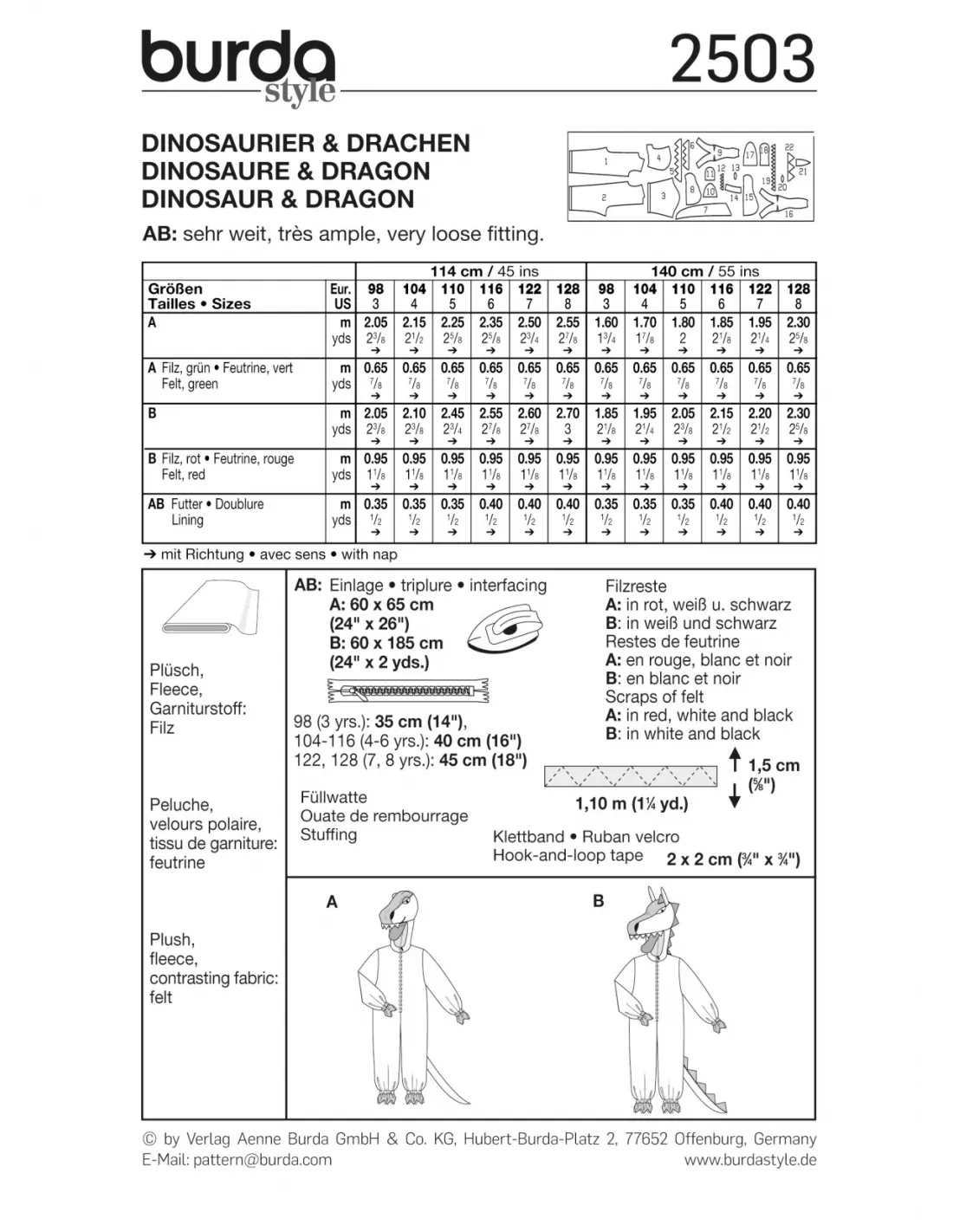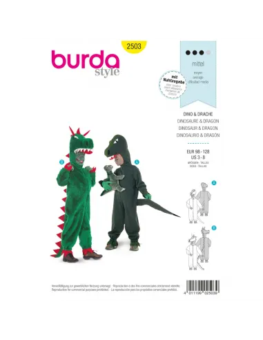 Patron Burda Carnaval 2503 - Déguisement Combinaison Dinosaure & Dragon enfant