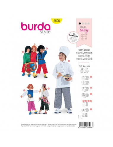 Burda CarnavalVariantes multiples à partir d'un simple shirt et d'un pantalon monté sur élastique, car détails et accessoires permettent de les métamorphoser en costume de pirate, de Max et Moritz ou de Petit Pierre Malpeigné ! Tissus conseillés: satin pour costume de Carnaval, cotonnade C I: tissu matelassé également ceinture BC: feutrineTailles 104 à 140 cm (4 à 10 ans)Niveau couture: Super Facile, rapide, idéal pour débutantMarges couture comprisesLangues incluses: Français, Deutsch, English, Español, Nederlands, Italiano,Svenska, Dansk, Pусский