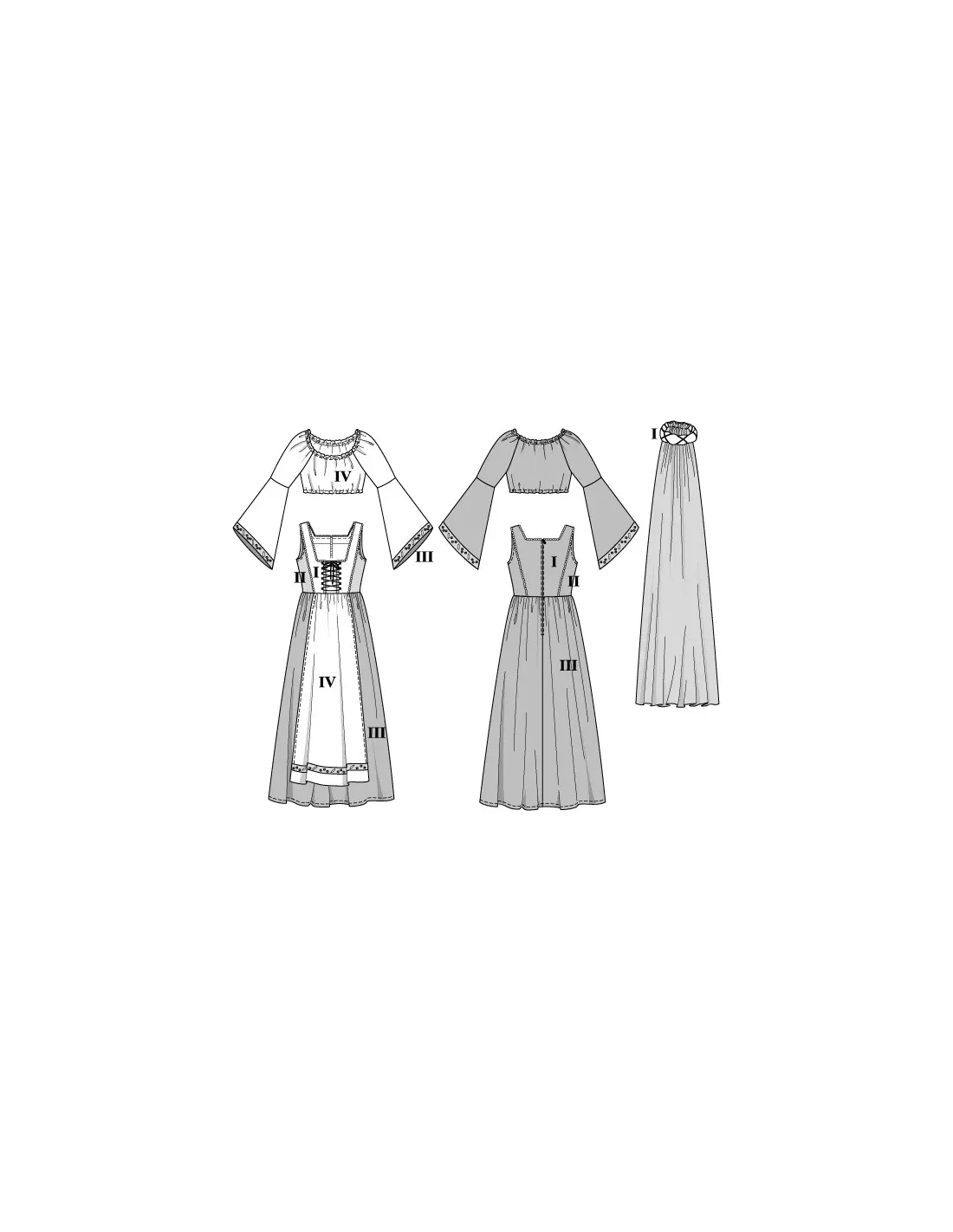Burda CarnavalRobe ajustée avec tablier assorti. Heureuse association de tissus nobles. A noter: le corsage court et la coiffe qui retient le voile en organza. Tissus conseillés: I, III: panne de velours II: tissu structuré IV: satin. Tailles femme: 36 à 50 Niveau couture: moyenMarges couture comprisesLangues incluses: Français, Deutsch, English, Español, Nederlands, Italiano,Svenska, Dansk, Pусский