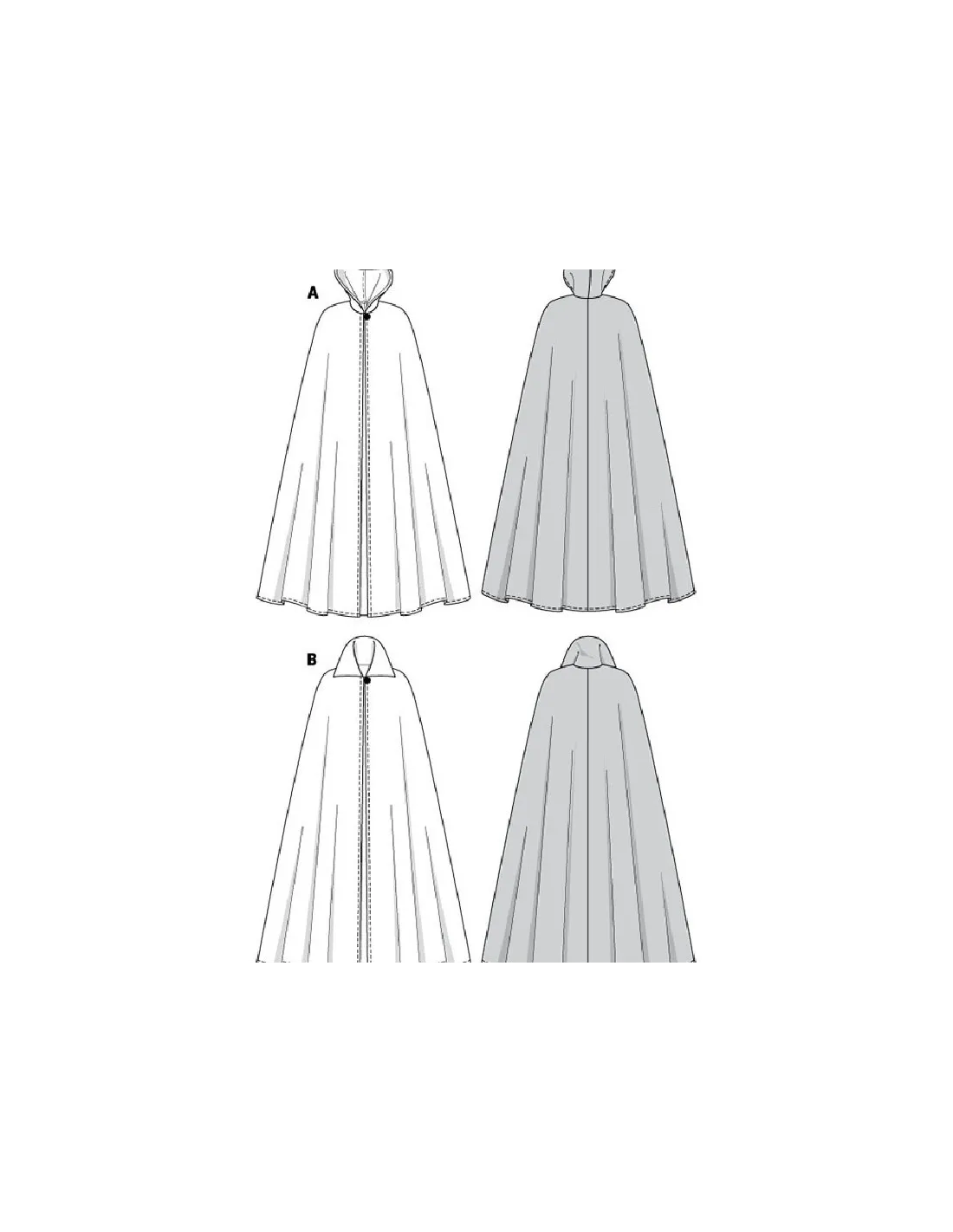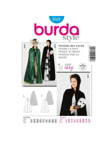 Burda CarnavalCape longue, A: avec capuchon, B: avec col à relever Les deux variantes sont fermées avec un bouton. Tissus conseillés: satin, taffetas, soie pour costume de Carnaval. Niveau couture: Super Facile, rapide, idéal pour débutantMarges couture comprisesTailles femme: 34 à 50Langues incluses: Français, Deutsch, English, Español, Nederlands, Italiano,Svenska, Dansk, Pусский