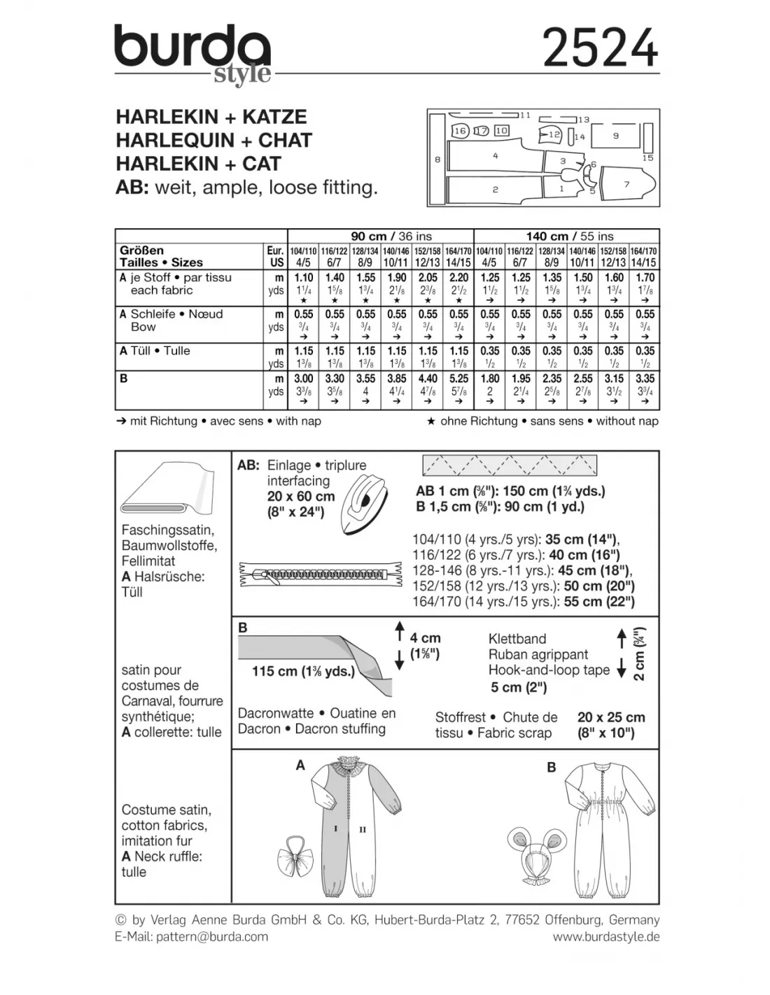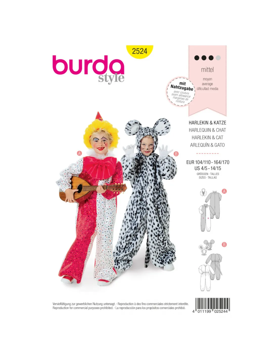 Patron Burda Carnaval 2524 - Déguisement Arlequin et Chat enfant