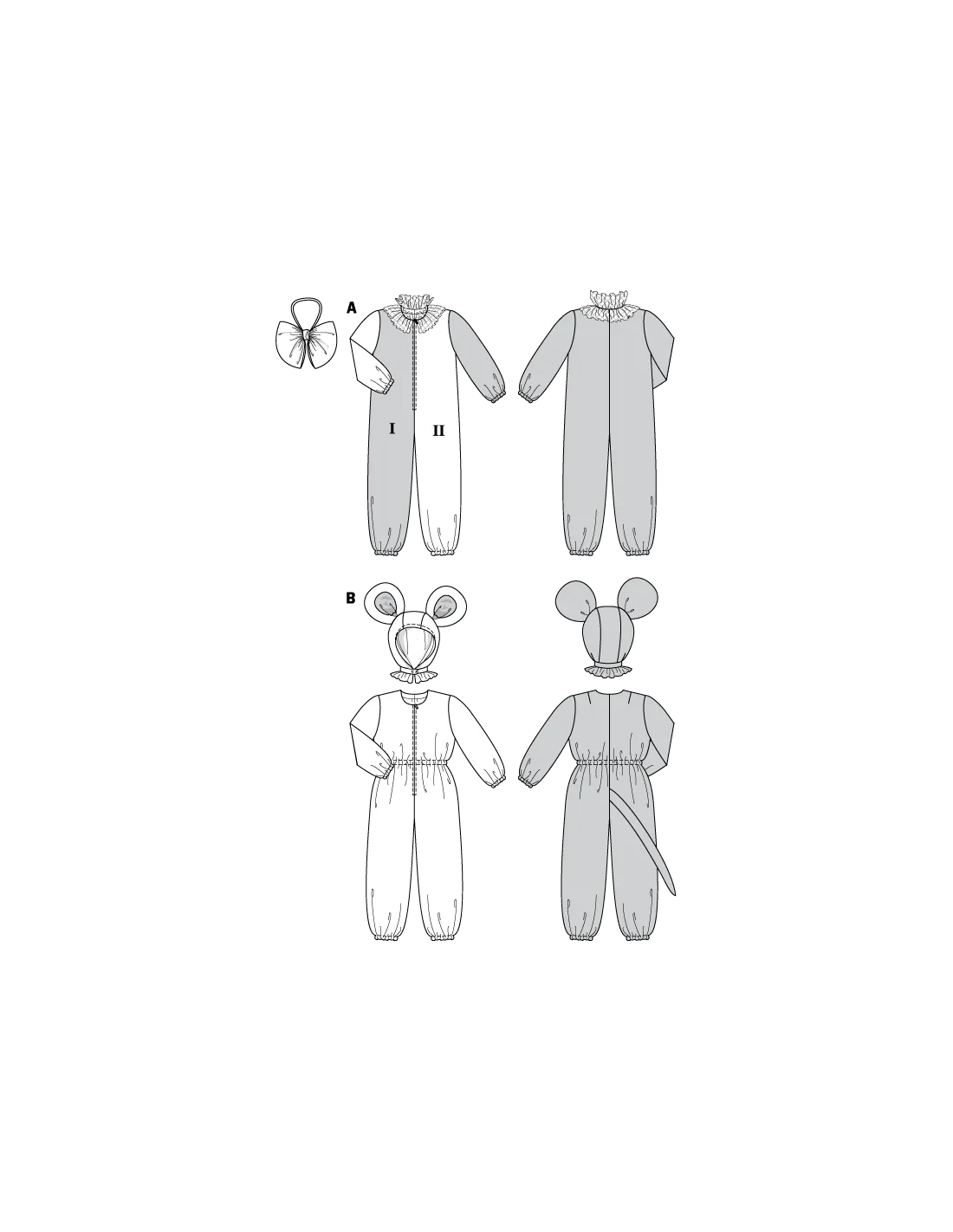 Burda CarnavalCombinaison ample resserrée par des élastiques sous coulisses au bas des manches et des jambes, également à la taille pour B.A: avec volant d'encolure et grand noeud B: avec capuchon à grandes oreilles cousu séparément. Tissus conseillés: satin pour costume de Carnaval, cotonnade B: fourrure synthétique également volant A: tulleNiveau couture: moyen Tailles 104/110, 116/122, 128/134, 140/146, 152/158, 164/170 (4/5 ans à 14/15 ans)Marges couture comprisesLangues incluses: Français, Deutsch, English, Español, Nederlands, Italiano,Svenska, Dansk, Pусский