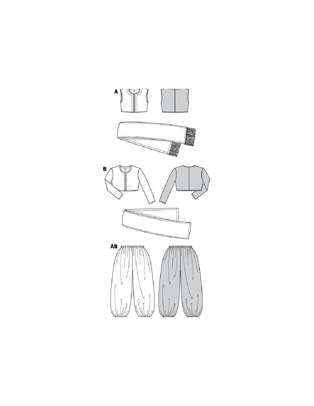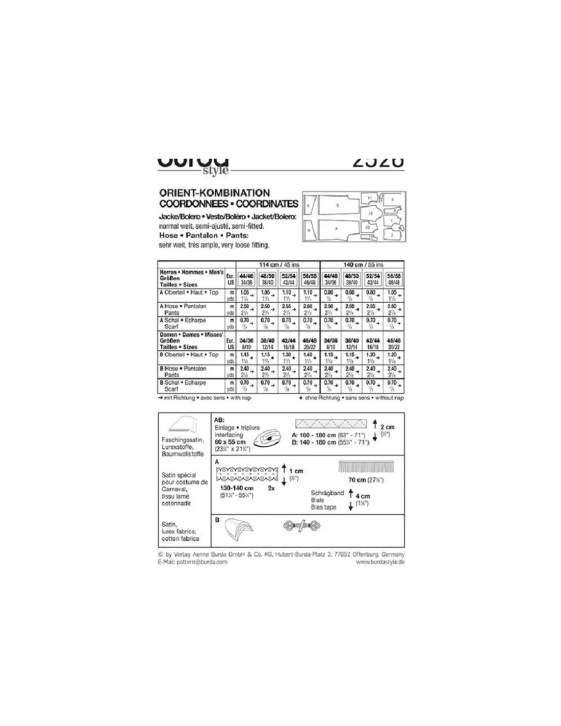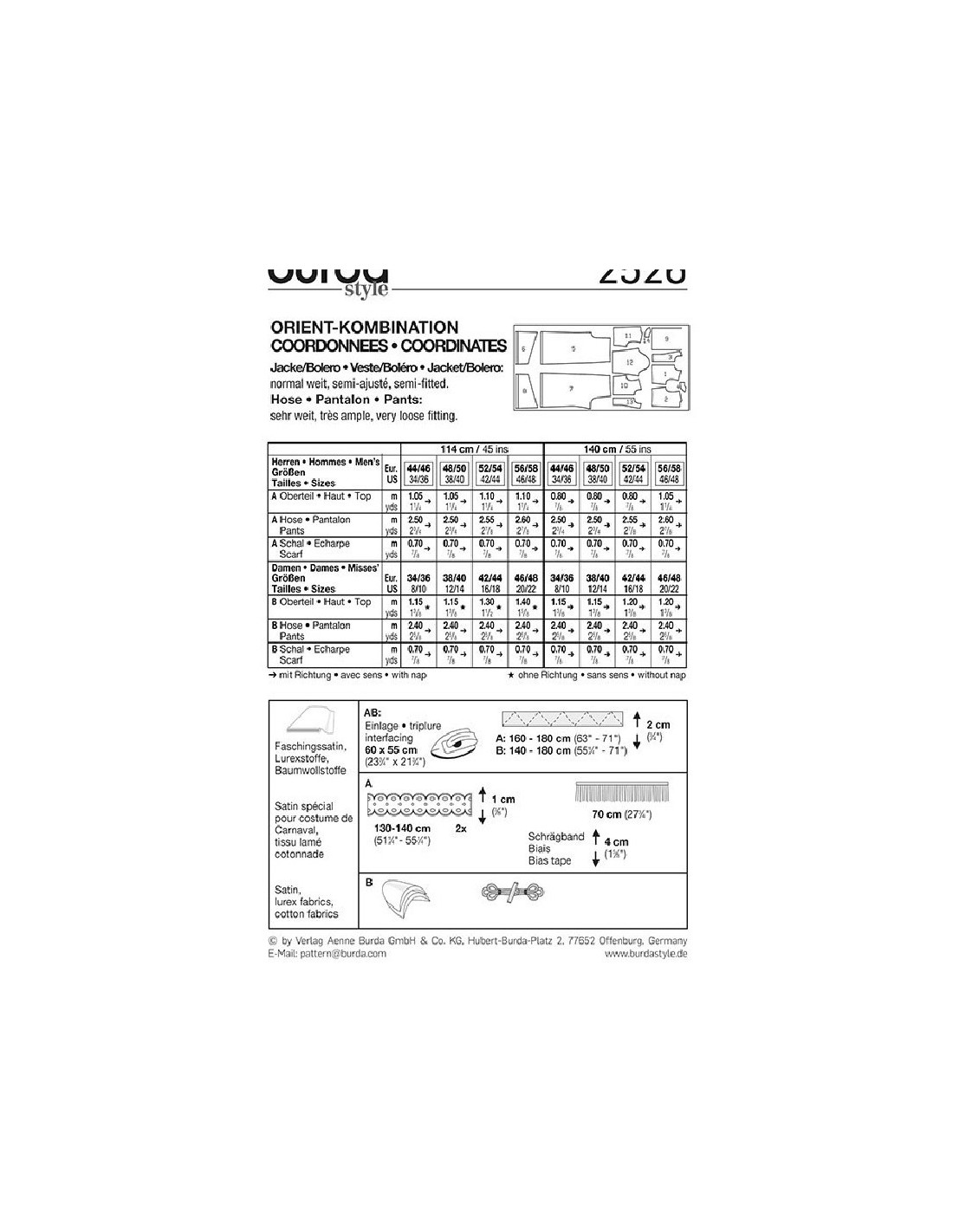 Burda CarnavalVeste et boléro d'ampleur normalePantalon bouffant particulièrement ample avec écharpe décorative bordée de franges à volonté.Tissus conseillés: satin pour costume de Carnaval, lurex, cotonnadeNiveau couture: Super Facile, rapide, idéal pour débutant Marges couture comprisesTailles femme: 34/36 à 46/48Tailles homme: 44/46 à 56/58Langues incluses: Français, Deutsch, English, Español, Nederlands, Italiano,Svenska, Dansk, Pусский
