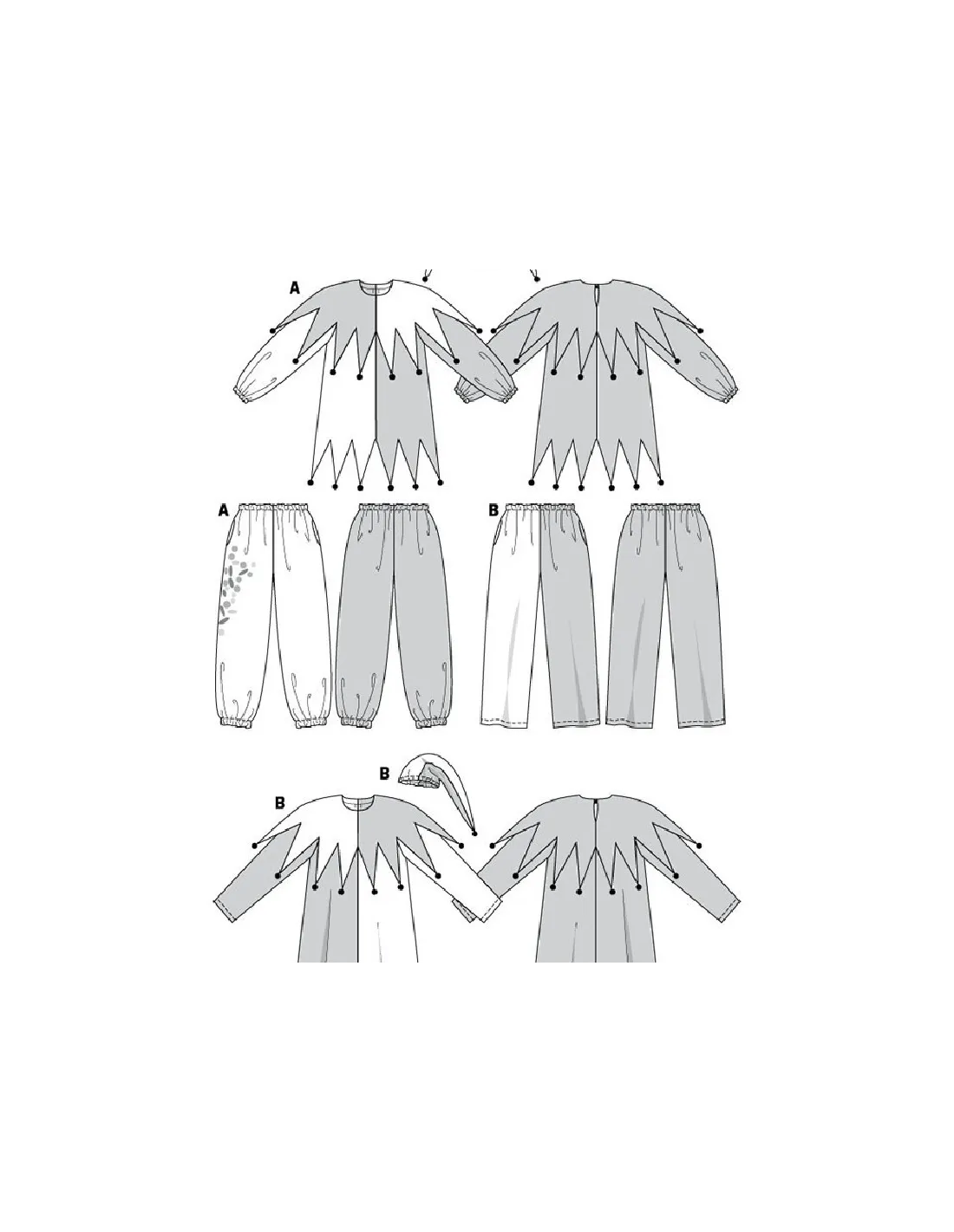 Burda CarnavalAB: particulièrement amples. 2 coordonnés composés d'une chemise, d'un pantalon et d'un bonnet. Le col, ainsi que le bord inférieur de la chemise A, sont coupés en pointes sur lesquelles sont cousus des grelots. Le pantalon est maintenu à la taille par une coulisse à élastique coulisses à élastiques également au bas des manches et des jambes pour A. Tissus conseillés: lurex, cotonnade, soie pour costume de Carnaval, satinTailles femme: 34/36 à 50/52Tailles homme: 44/46 à 56/58Marges couture comprisesNiveau couture: moyenLangues incluses: Français, Deutsch, English, Español, Nederlands, Italiano,Svenska, Dansk, Pусский