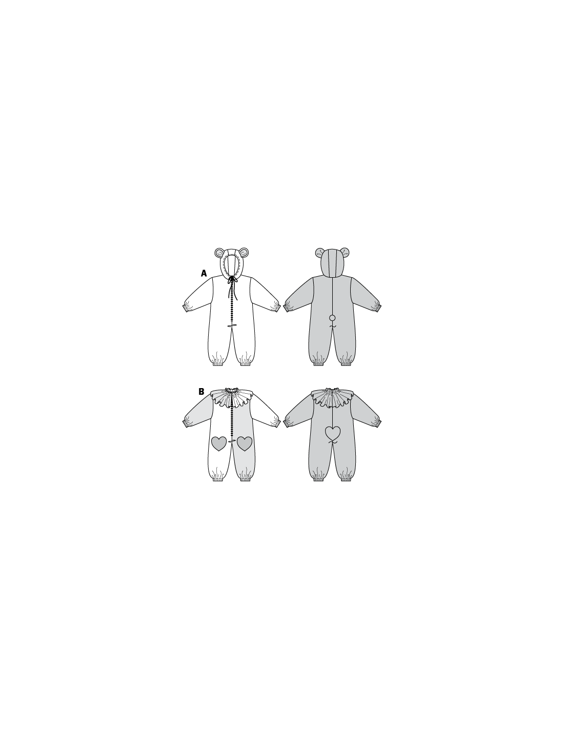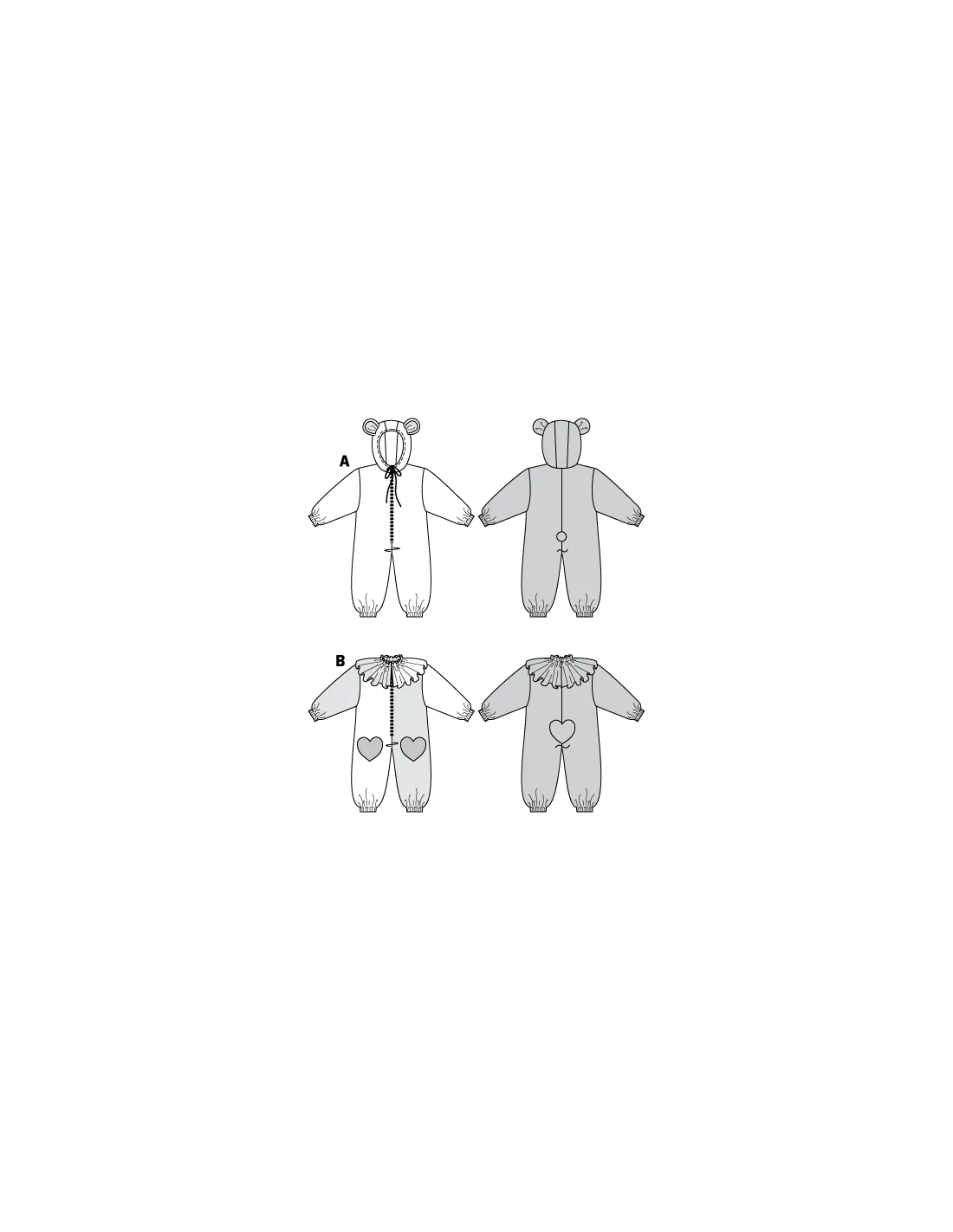 Burda CarnavalCombinaison, très amples, avec fermeture à glissière et coulisses à élastiques: A: Nounours (combinaison avec capuchon et oreilles) B: Clown (combinaison coupée dans deux tissus, avec col plissé et cœurs appliqués). Tissus conseillés A: fourrure synthétique, peluche , tissu de garniture: cotonnade B: cotonnade, soie pour costume de CarnavalTailles enfant: 68 à 98 cm (6 mois à 3 ans)Niveau couture: moyenMarges couture comprisesLangues incluses: Français, Deutsch, English, Español, Nederlands, Italiano,Svenska, Dansk, Pусский