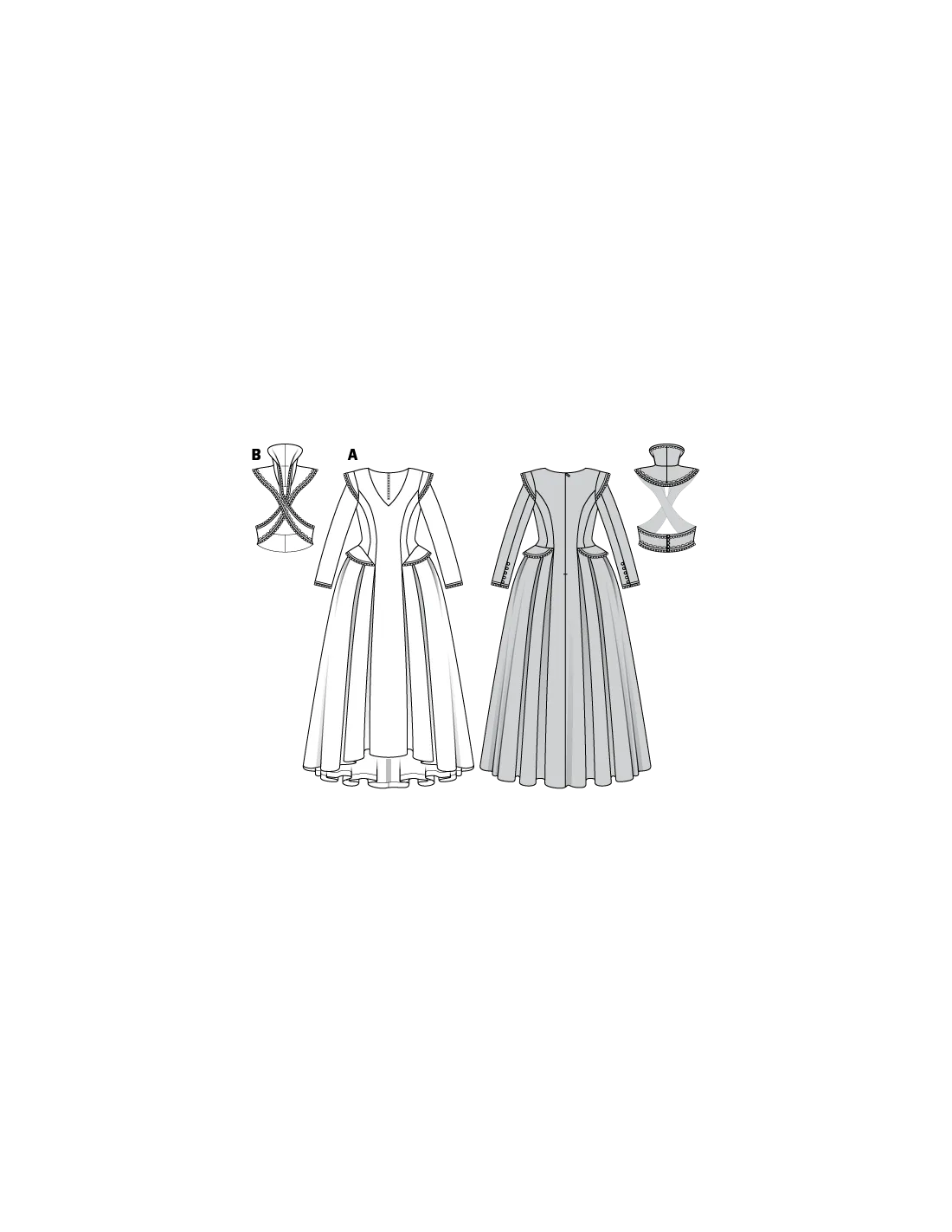 Burda CarnavalRenaissance - une robe longue festive avec une jupe évaséeTaille FR : de 34 à 44 Niveau de difficulté : expérimenté Tissus conseillés : A I, B : brocart, tissu moiré, tissu jacquard, A II : gaze (pour renforcer la jupe)Langues incluses : Français, Deutsch, English, Español, Nederlands, Italiano,Svenska, Dansk, Pусский